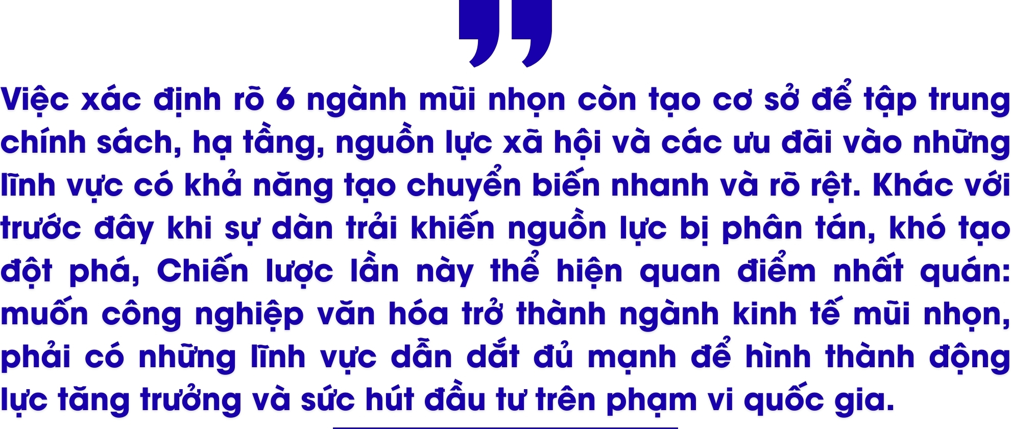 * Ở góc độ ưu tiên ngành, Chiến lược tập trung phát triển 6 ngành: điện ảnh; nghệ thuật biểu diễn; phần mềm và trò chơi giải trí; quảng cáo; thủ công mỹ nghệ; du lịch văn hóa. Theo ông, việc "khoanh" 6 ngành mũi nhọn như vậy thể hiện điều gì mới trong cách lựa chọn ưu tiên, so với tình trạng dàn trải trước đây?
