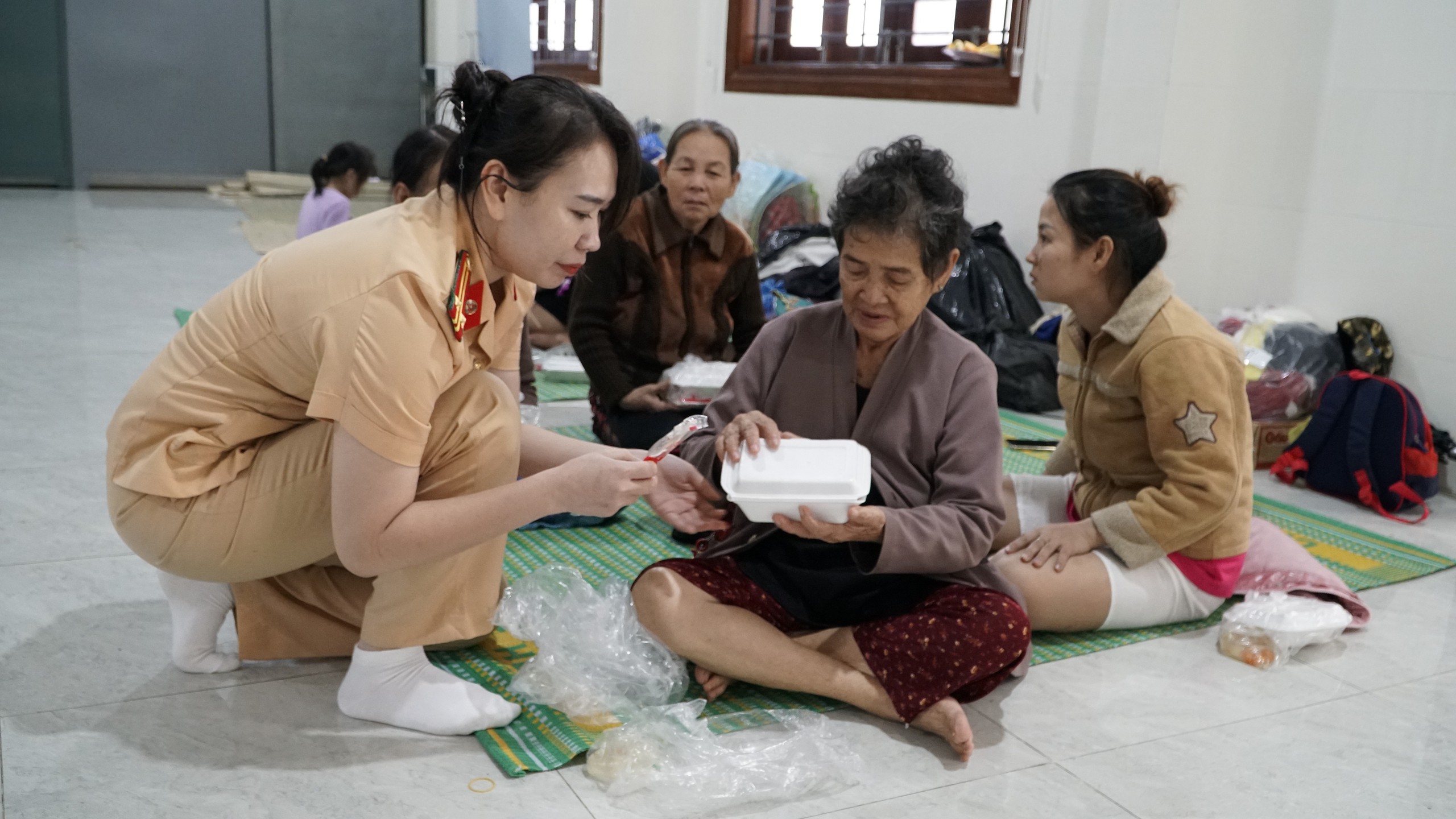 Lực lượng CSGT Gia Lai nỗ lực đảm bảo điều kiện ăn ở cho người dân đến sơ tán. Ảnh: Đình Quân-TTXVN