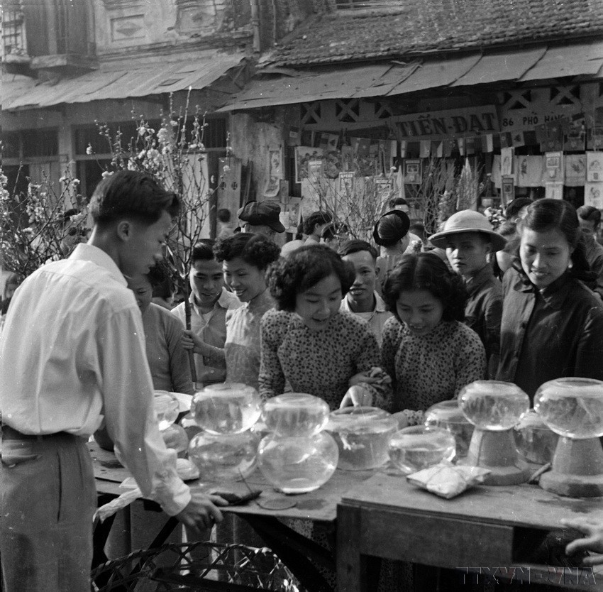 Người dân thủ đô chọn mua cá vàng tại phố Hàng Lược trong ngày 28, 29 và 30 Tết (Hà Nội, 1966). Ảnh: TTXVN