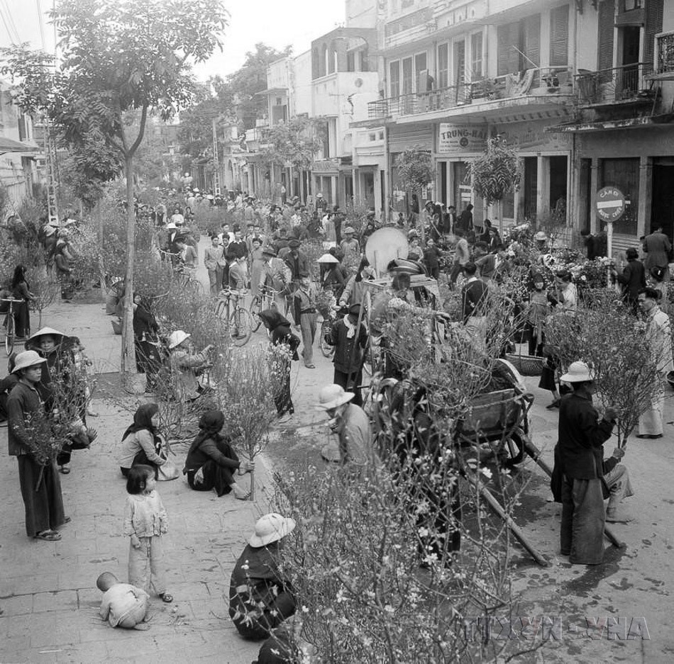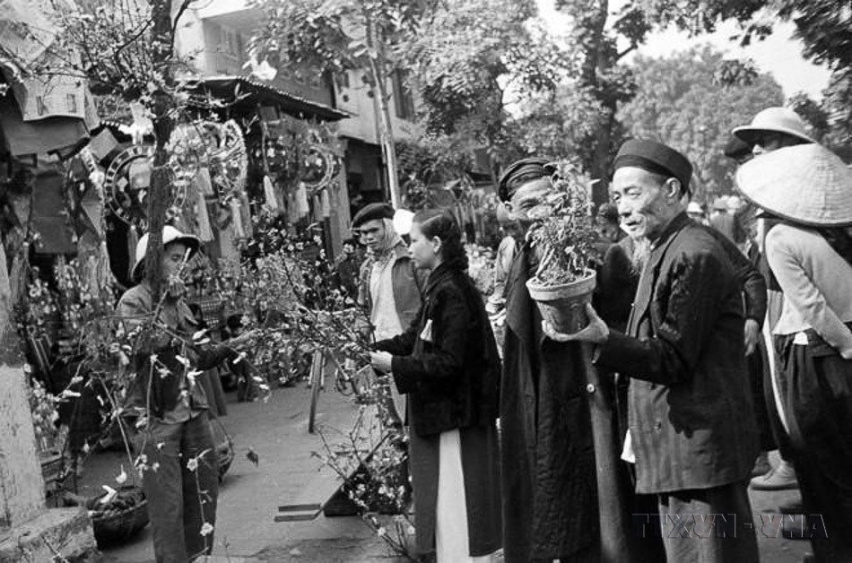 Người dân thủ đô chọn mua hoa và cành đào tại phố Hàng Lược trong ngày 28, 29 và 30 Tết (Hà Nội, 1966). Ảnh: TTXVN