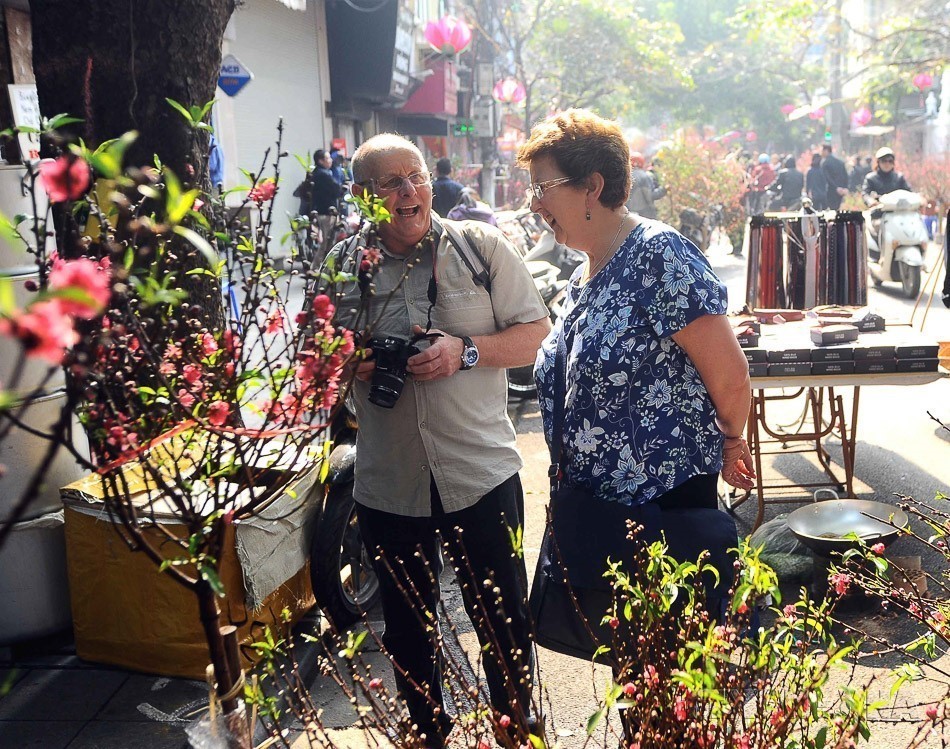Khách quốc tế thích thú với khung cảnh chợ hoa Hàng Lược Tết Ất Mùi (2015). Ảnh: Minh Đức - TTXVN