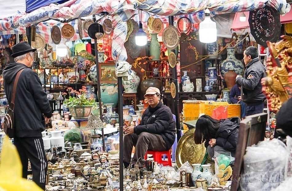 Khu vực chợ đồ cũ, điểm nhấn của chợ hoa truyền thống Hàng Lược luôn thu hút những người lớn tuổi (2025). Ảnh: Khánh Hoà - TTXVN
