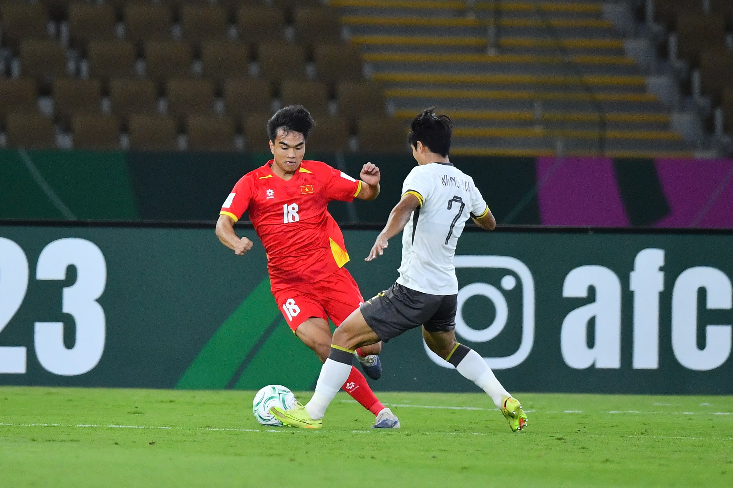 49': Văn Thuận có tình huống đột phá trong vòng cấm của U23 Hàn Quốc nhưng không vượt qua được cầu thủ đối phương.