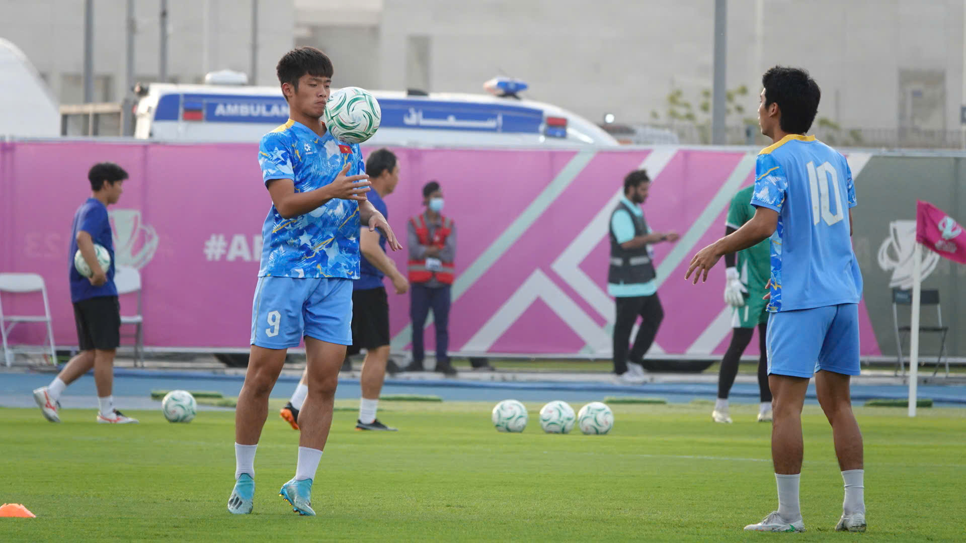 9': Thái Sơn để mất bóng nhưng sau đó, đồng đội của cầu thủ này đã kịp thời bọc lót để giành lại quả bóng. U23 Việt Nam vẫn đang duy trì được thế trận tích cực.