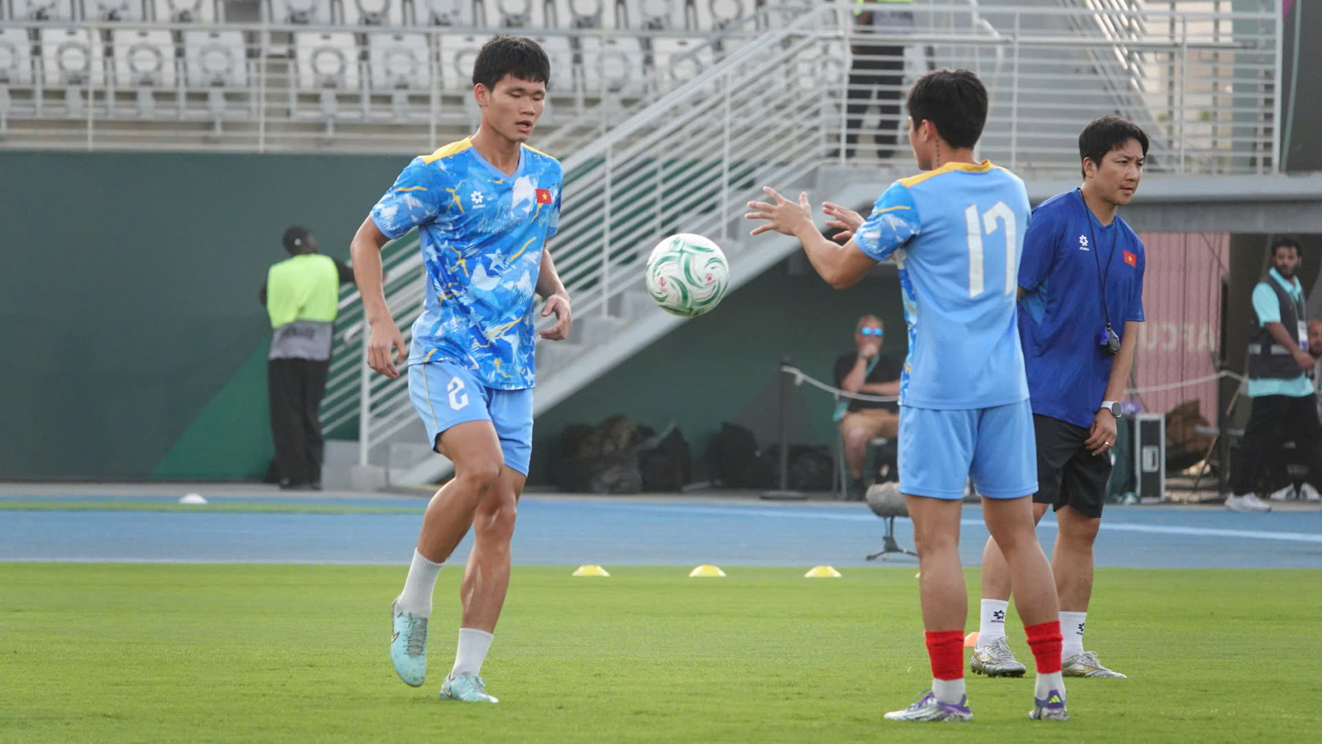 Các cầu thủ U23 Việt Nam khởi động - Ảnh: Ted Trần