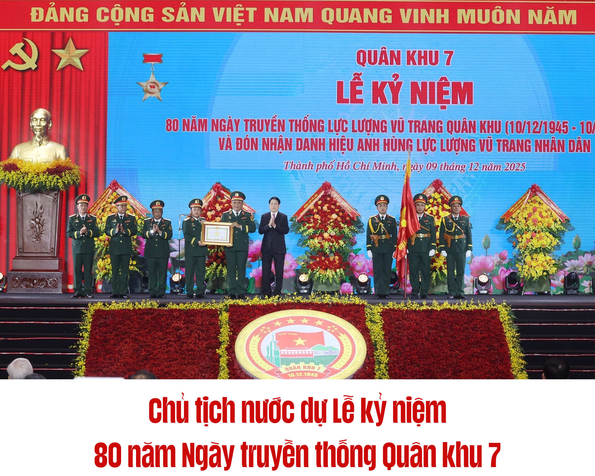 Sáng 9/12/2025, tại Thành phố Hồ Chí Minh, Chủ tịch nước Lương Cường, Chủ tịch Hội đồng Quốc phòng và An ninh, Thống lĩnh LLVT Nhân dân dự Lễ kỷ niệm 80 năm Ngày truyền thống Lực lượng vũ trang Quân khu 7 (10/12/1945 - 10/12/2025) và đón nhận danh hiệu Anh hùng Lực lượng vũ trang nhân dân.