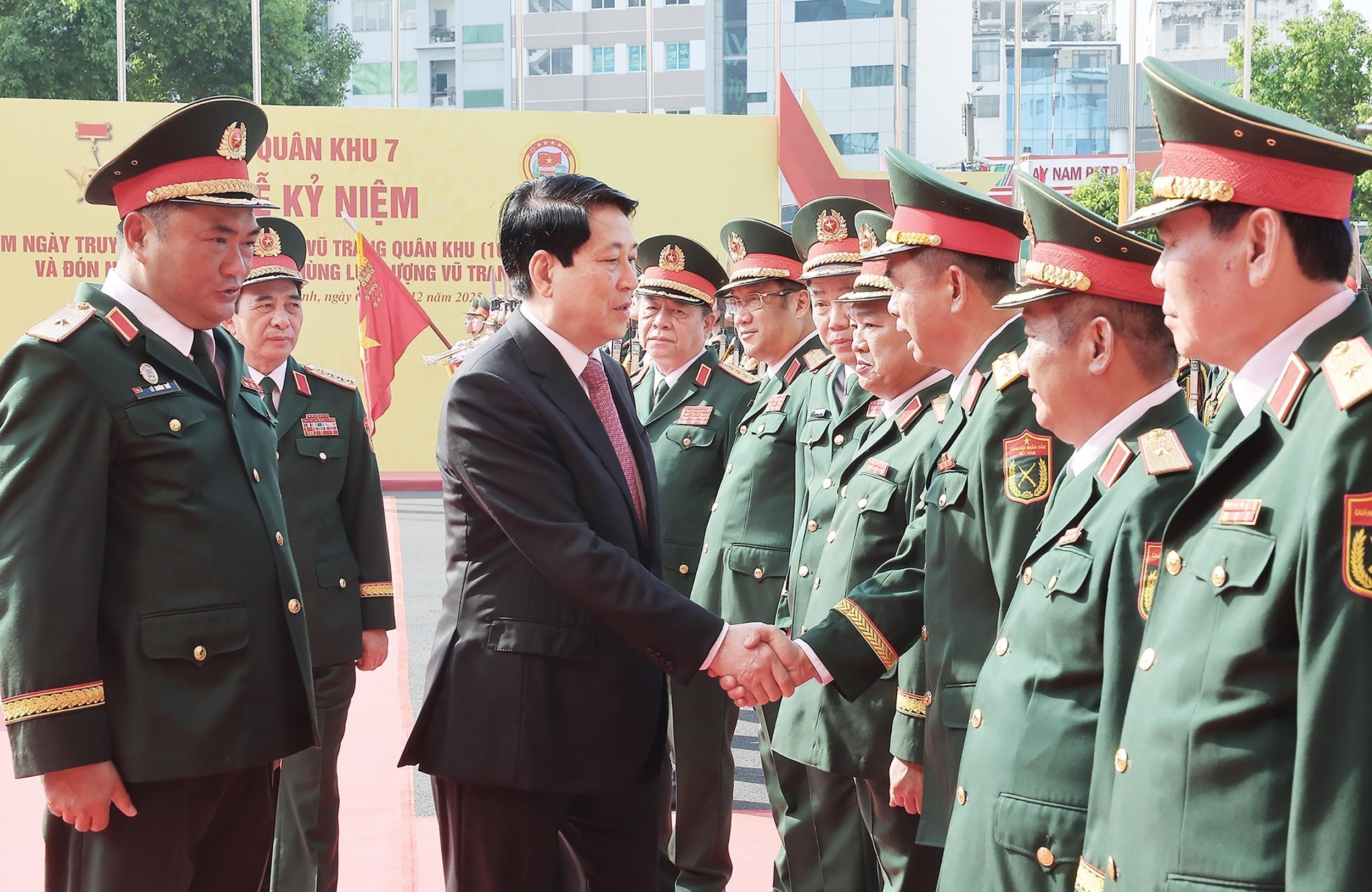 Thay mặt lãnh đạo Đảng, Nhà nước, Chủ tịch nước đánh giá cao và nhiệt liệt chúc mừng những chiến công, thành tích và đóng góp to lớn của Lực lượng vũ trang Quân khu 7 đối với sự nghiệp cách mạng vẻ vang của Đảng, của dân tộc trong suốt 80 năm qua.