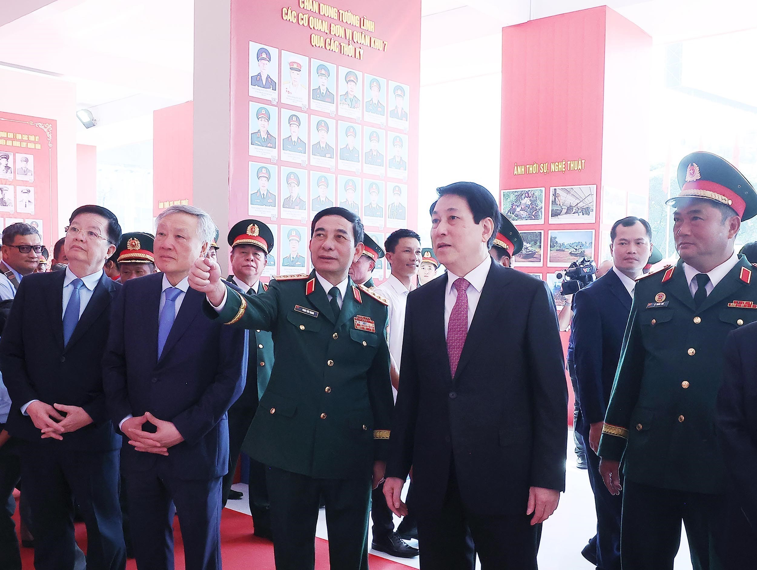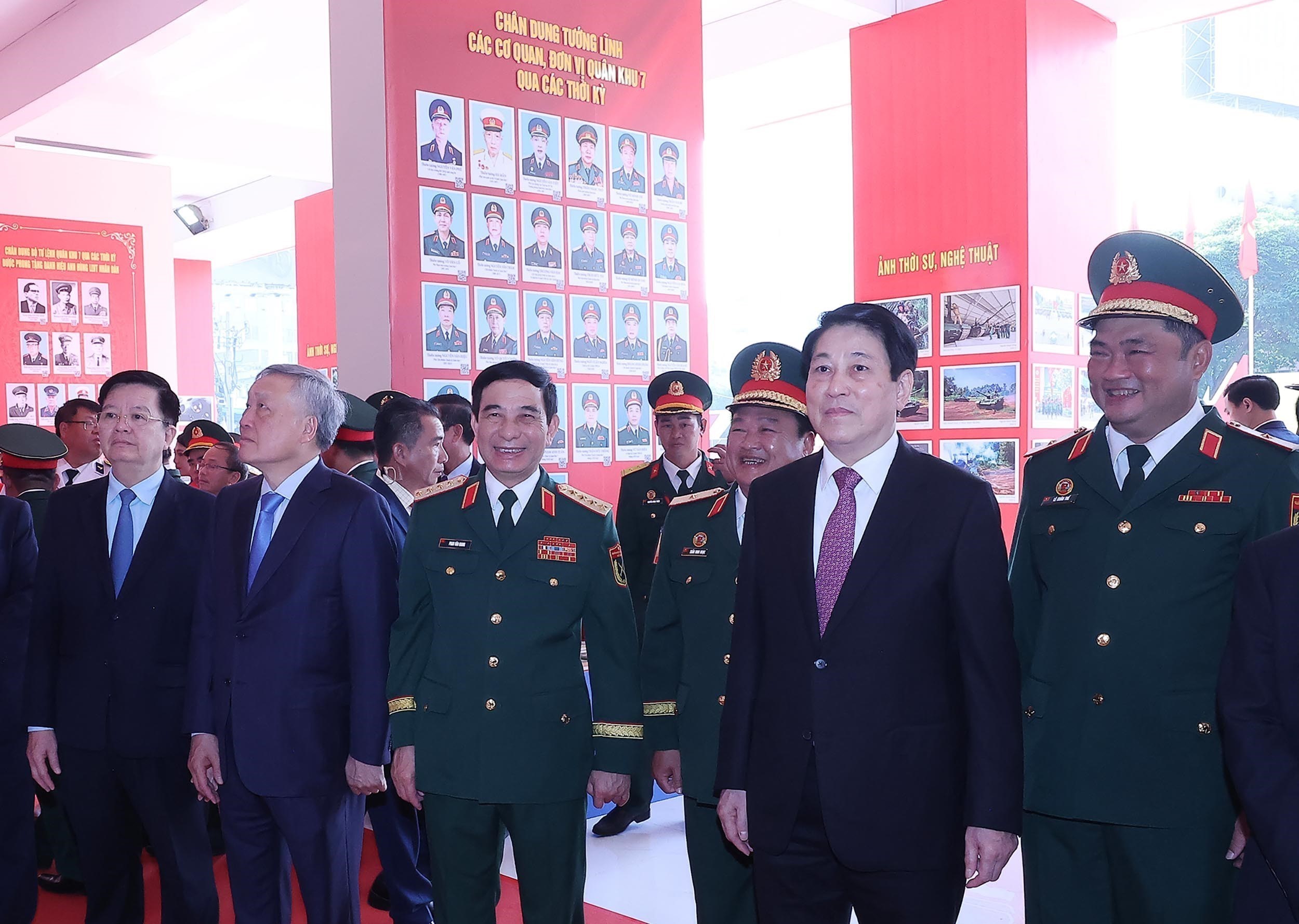 Chủ tịch nước Lương Cường và các đại biểu tham quan trưng bày kỷ niệm 80 năm Ngày truyền thống Lực lượng vũ trang Quân khu 7. Ảnh: Lâm Khánh - TTXVN