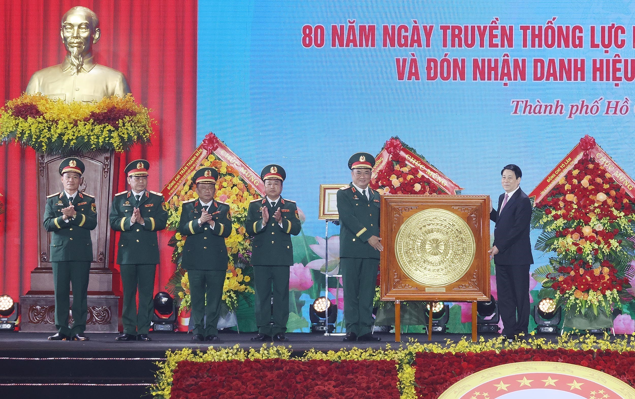 Chủ tịch nước Lương Cường trao danh hiệu Anh hùng Lực lượng vũ trang nhân dân tặng Quân khu 7. Ảnh: Lâm Khánh - TTXVN