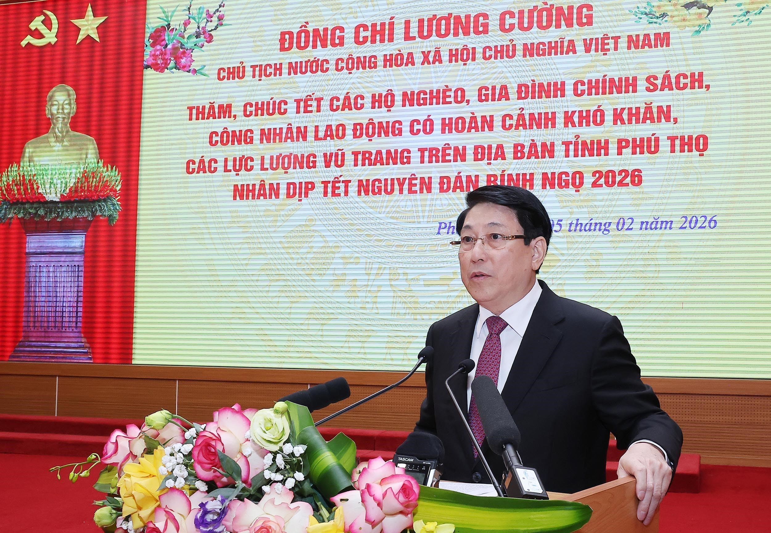 Trước thềm Tết cổ truyền của dân tộc, Chủ tịch nước đề nghị cấp ủy, chính quyền các cấp tỉnh Phú Thọ tiếp tục quán triệt sâu sắc, tổ chức thực hiện nghiêm túc, chặt chẽ các chủ trương, chính sách của Đảng, Nhà nước về chăm lo đời sống nhân dân, tổ chức Tết Bính Ngọ năm 2026 bảo đảm vui tươi, lành mạnh, an toàn, tiết kiệm, mọi người, mọi nhà đều được vui Xuân, đón Tết.