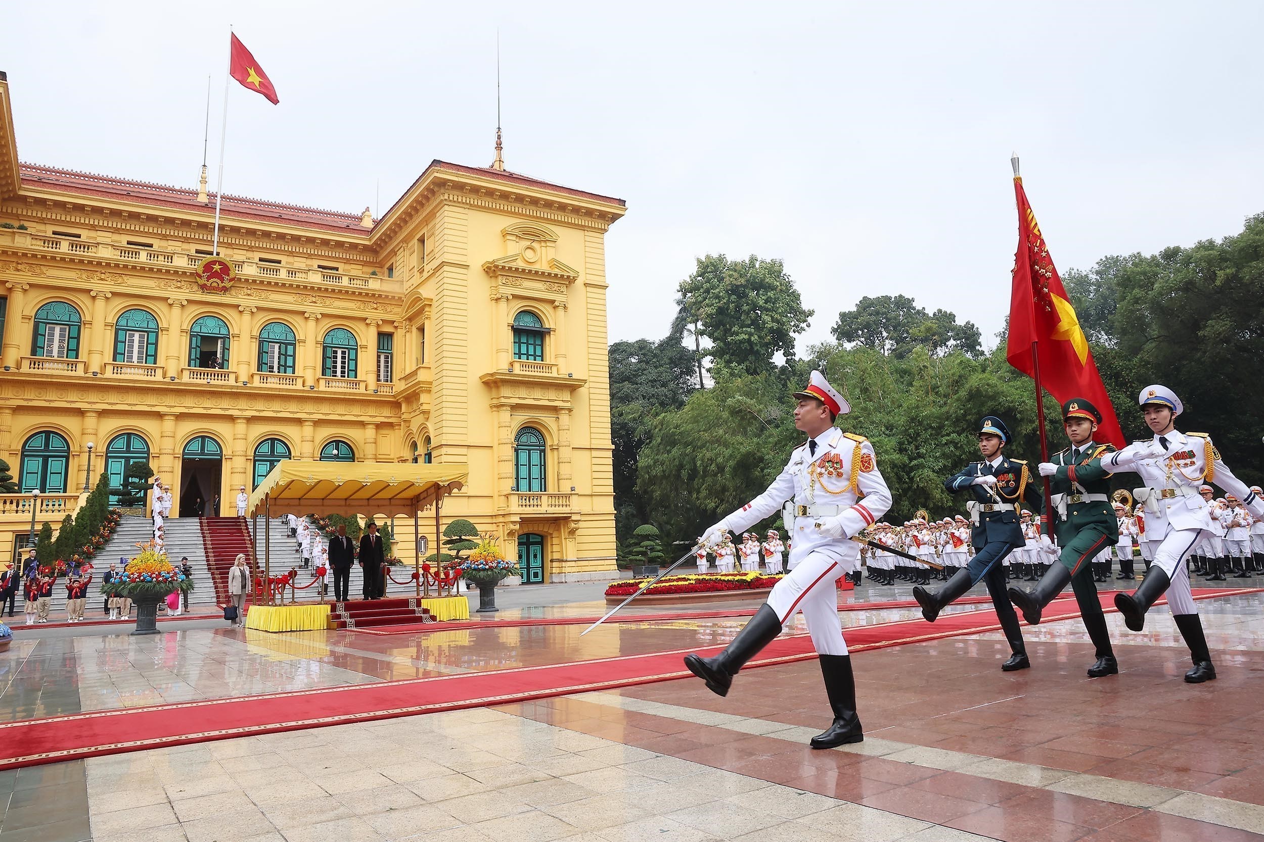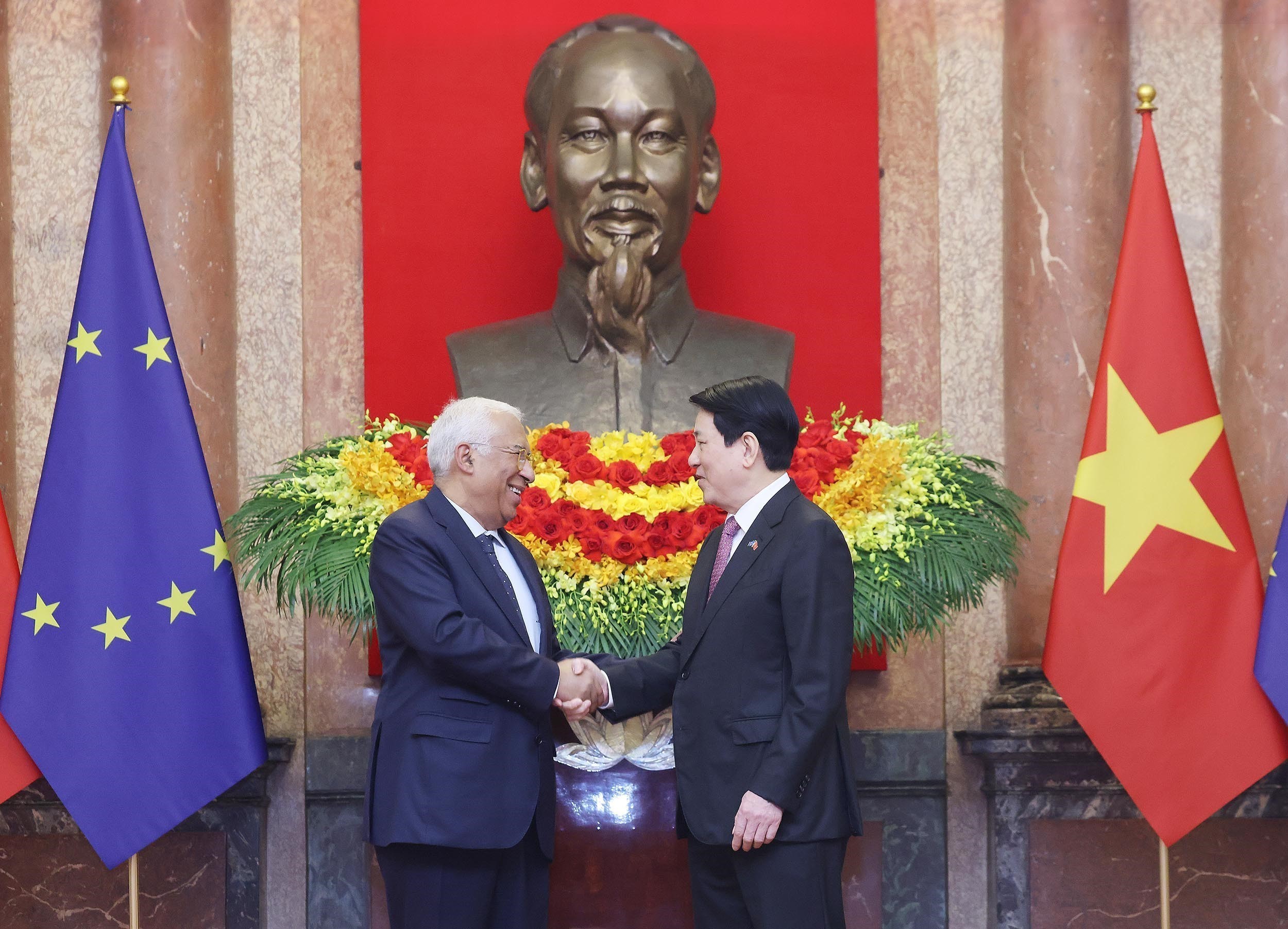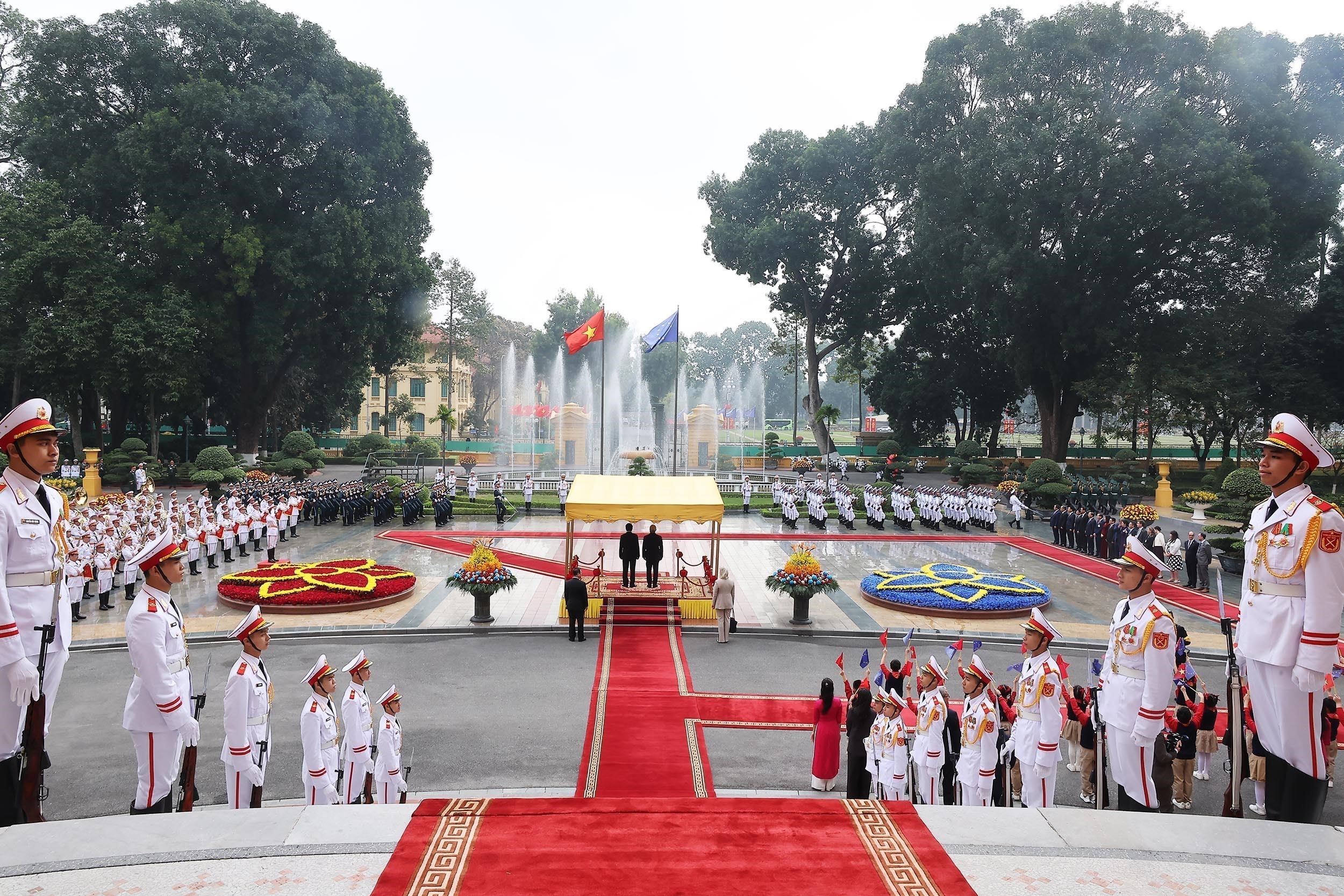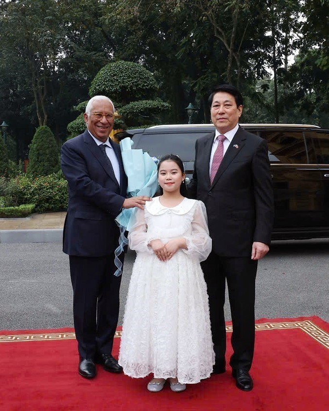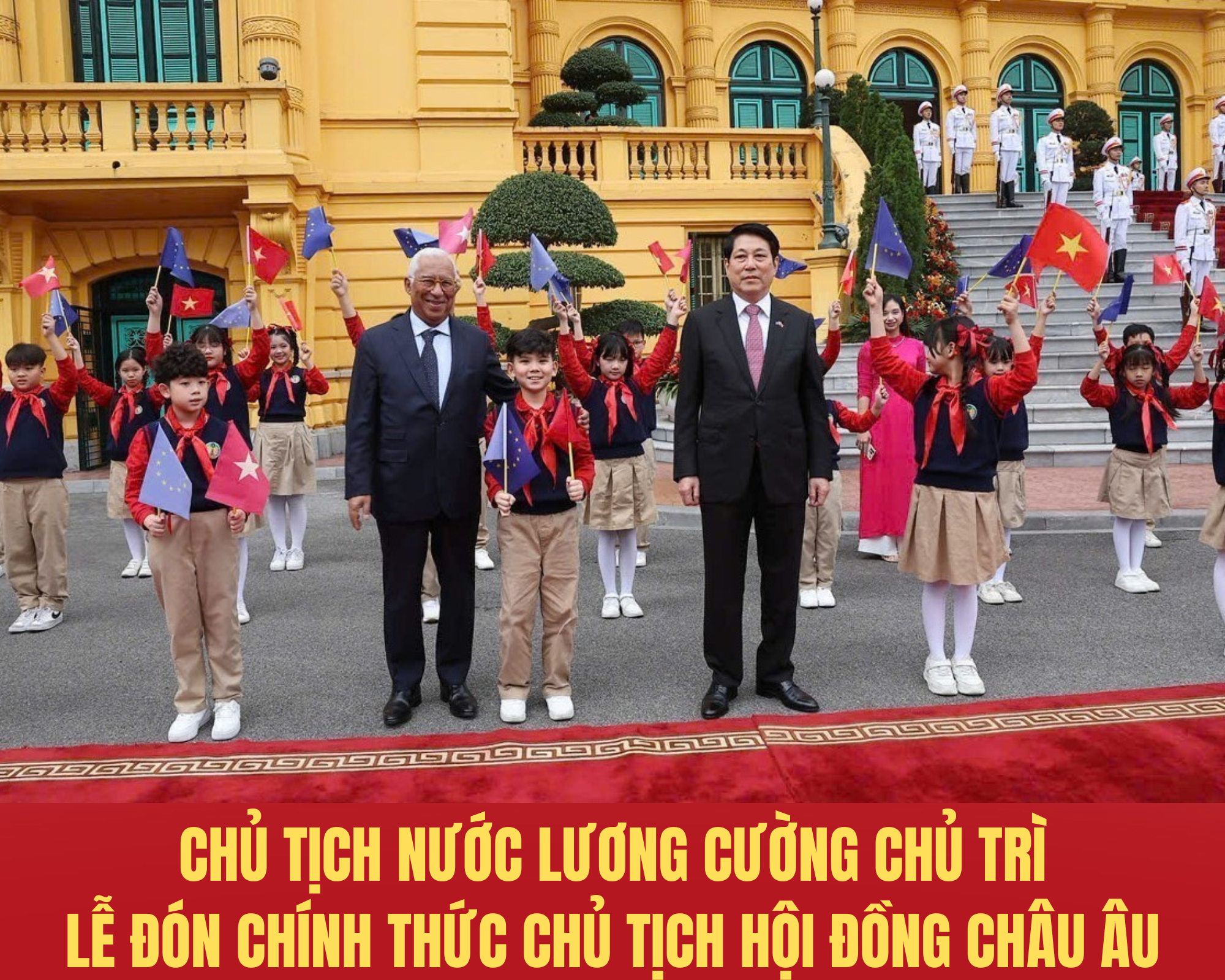 Đoàn xe hộ tống đưa Chủ tịch Hội đồng châu Âu António Costa tiến vào Phủ Chủ tịch, Chủ tịch nước Lương Cường có mặt tại thảm đỏ nồng nhiệt chào đón ông António Costa dẫn đầu Đoàn cấp cao EU thăm chính thức Việt Nam. Đại diện thiếu nhi thủ đô tiến tới trao tặng Chủ tịch Hội đồng châu Âu bó hoa tươi thắm.