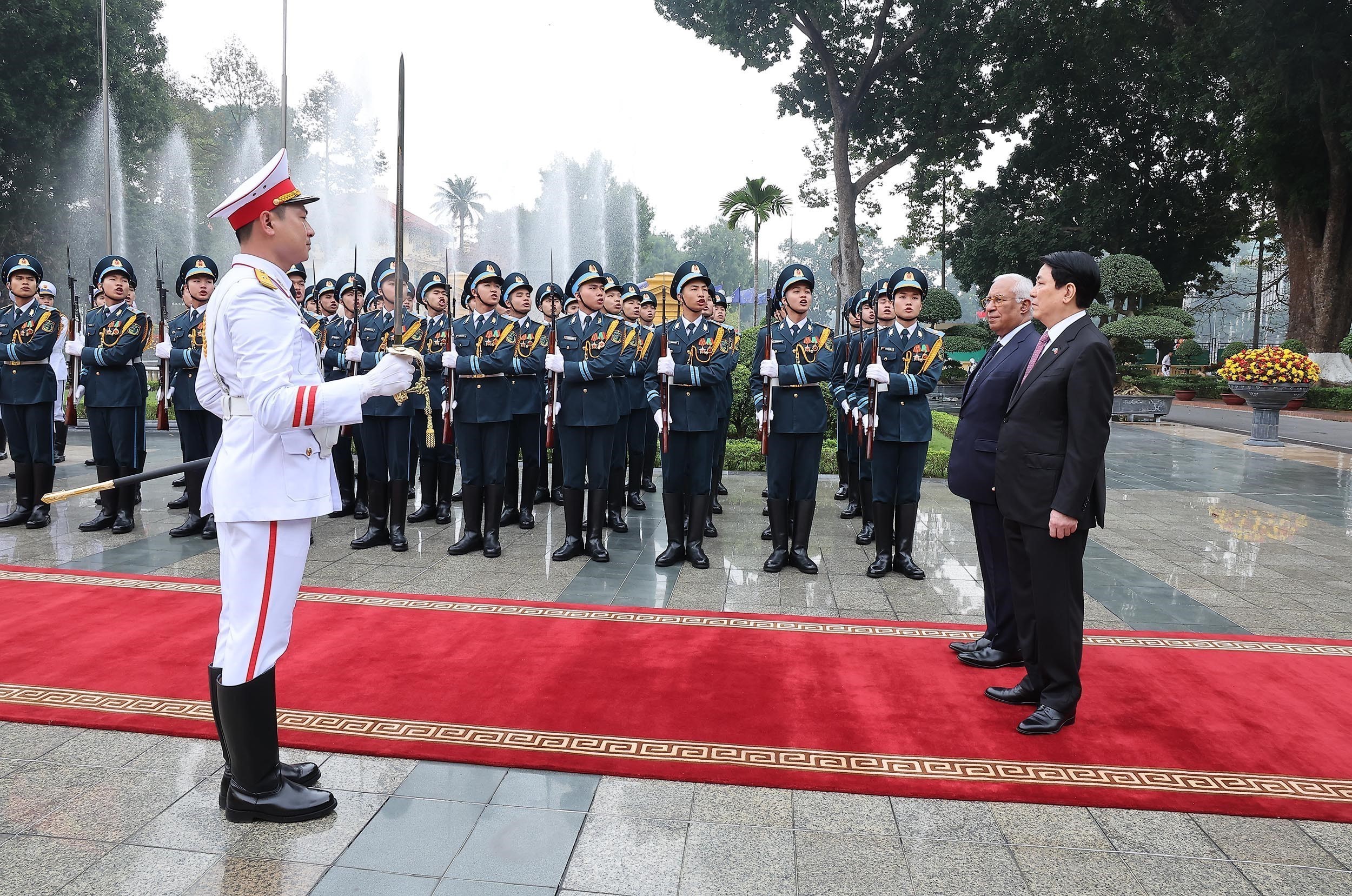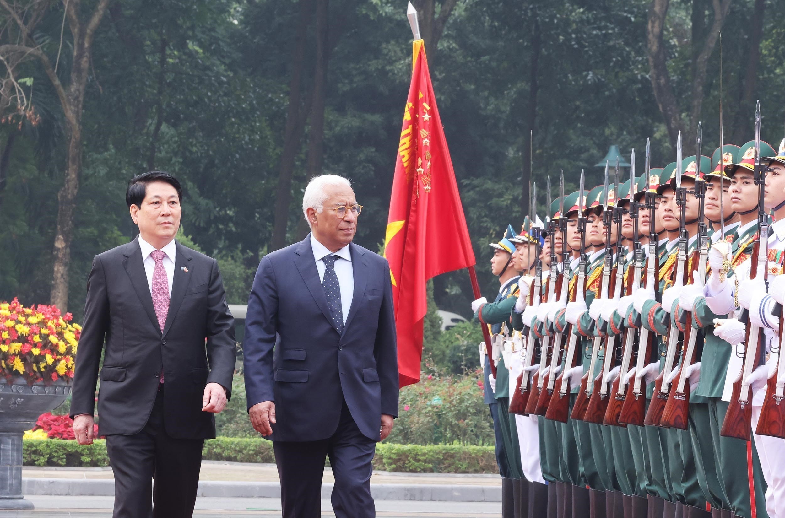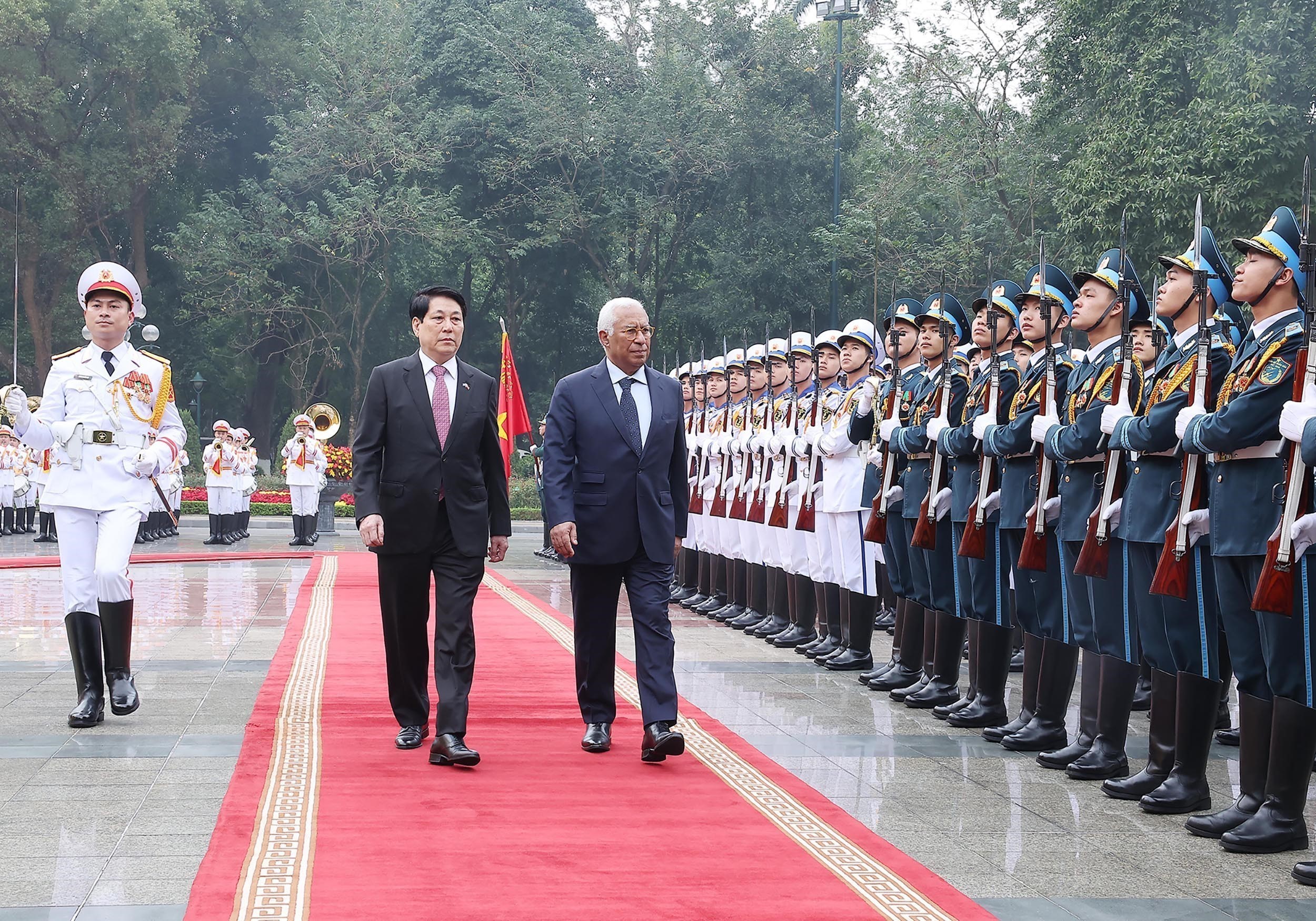 Chủ tịch nước Lương Cường và Chủ tịch Hội đồng châu Âu António Costa duyệt Đội danh dự Quân đội nhân dân Việt Nam. Ảnh: Lâm Khánh – TTXVN
