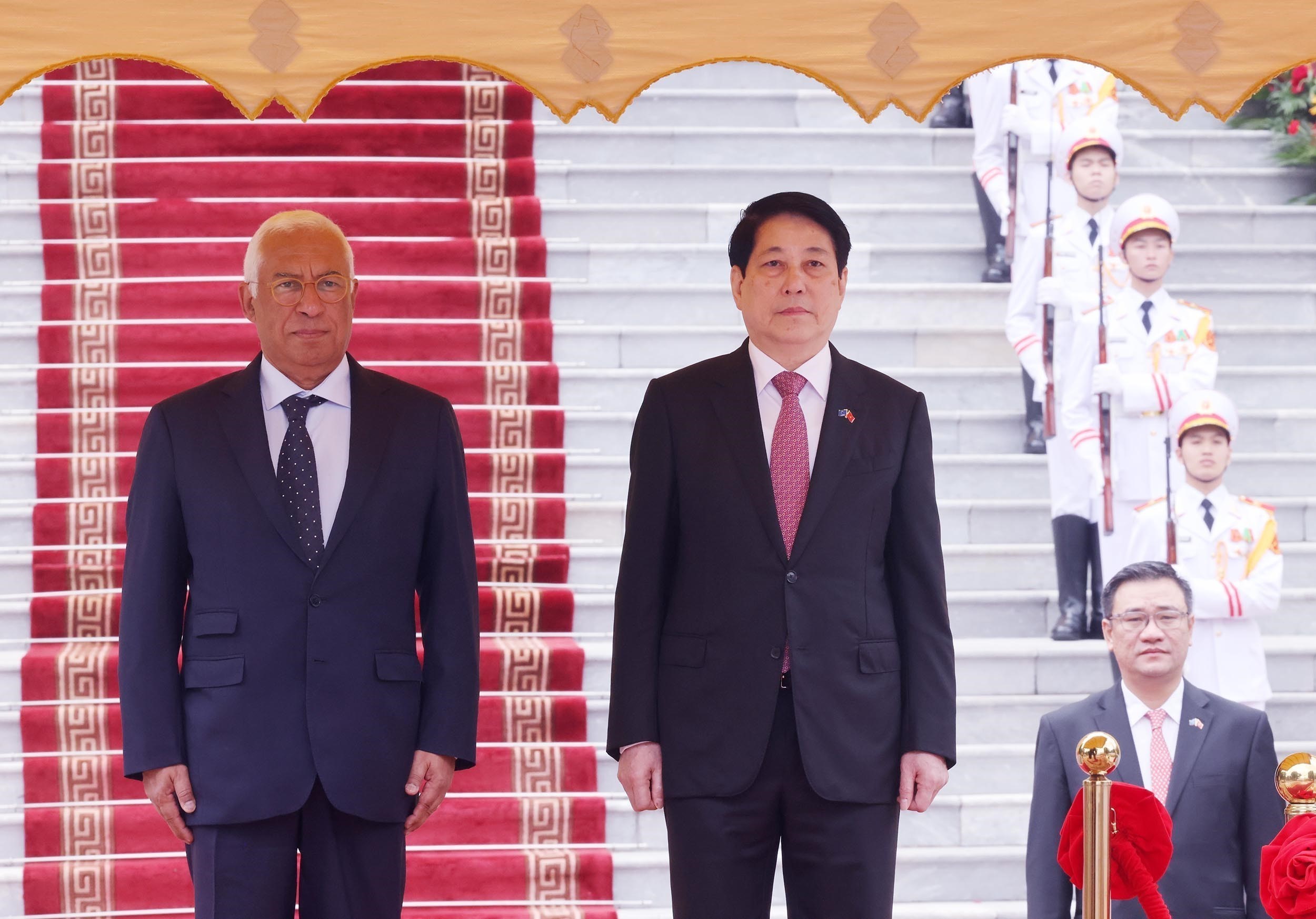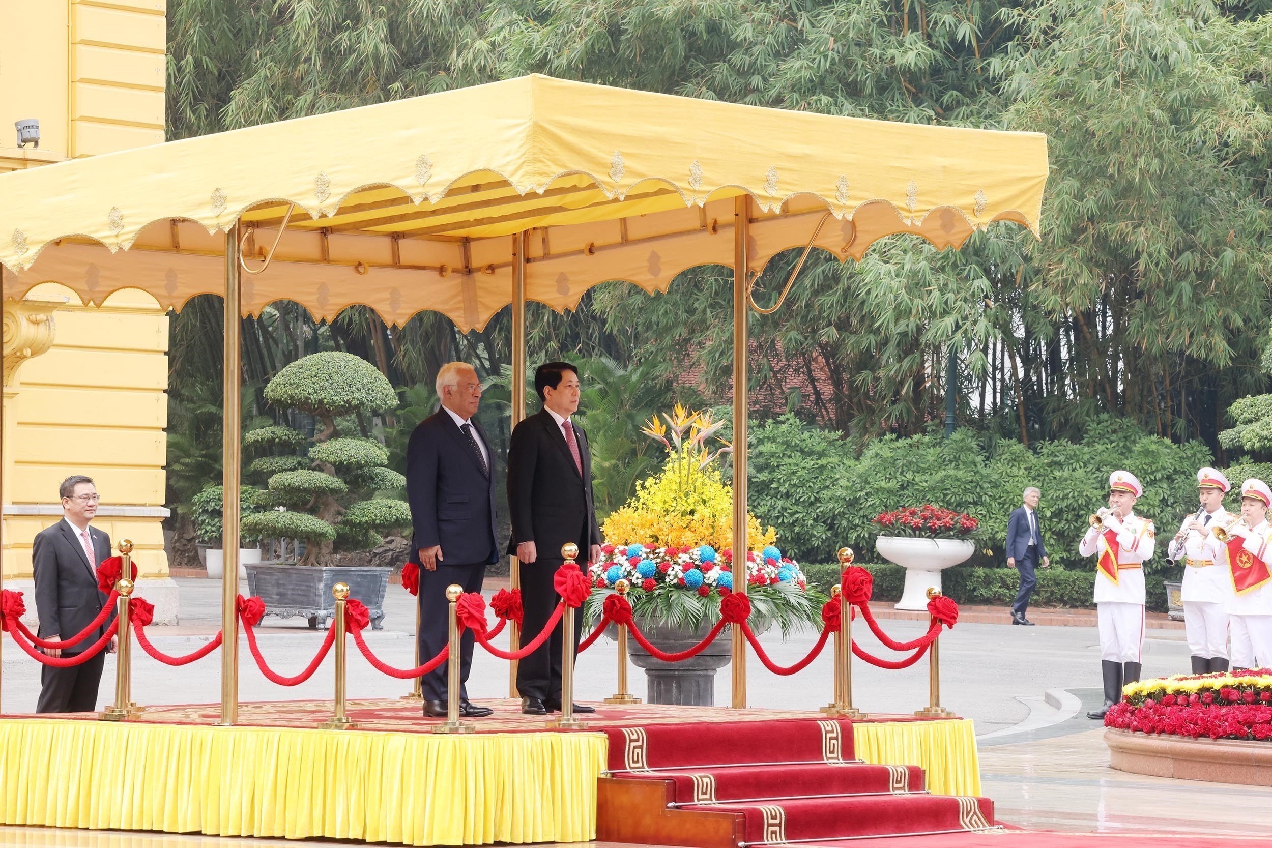 Chủ tịch nước Lương Cường và Chủ tịch Hội đồng châu Âu António Costa trên bục danh dự nghe quân nhạc cử quốc thiều. Ảnh: Lâm Khánh – TTXVN