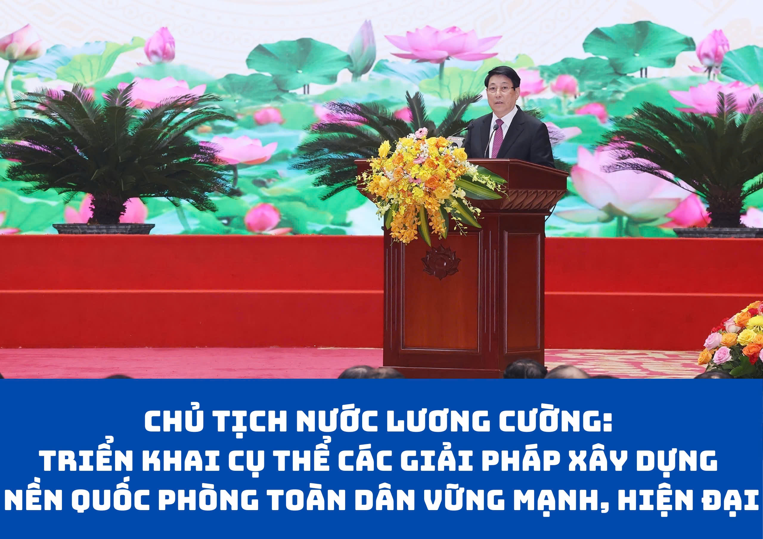 Chủ tịch nước yêu cầu phối hợp triển khai cụ thể các giải pháp xây dựng nền quốc phòng toàn dân vững mạnh, hiện đại; xây dựng phòng thủ quân khu, khu vực phòng thủ các cấp vững chắc trong điều kiện mới, đặc biệt phải bảo đảm đồng bộ với tổ chức chính quyền địa phương 2 cấp và đơn vị hành chính cấp tỉnh, cấp xã sau khi được tổ chức lại, thực sự hoạt động hiệu lực, hiệu quả. Tiếp tục thực hiện tốt chủ trương kết hợp quốc phòng với kinh tế, kinh tế với quốc phòng; phát huy vai trò rất quan trọng, làm nòng cốt của các binh đoàn, đoàn kinh tế - quốc phòng tham gia phát triển kinh tế - xã hội, ổn định dân cư ở địa bàn biên giới, biển đảo, góp phần xây dựng thế trận quốc phòng, bảo vệ vững chắc chủ quyền lãnh thổ, biên giới, biển đảo quốc gia.