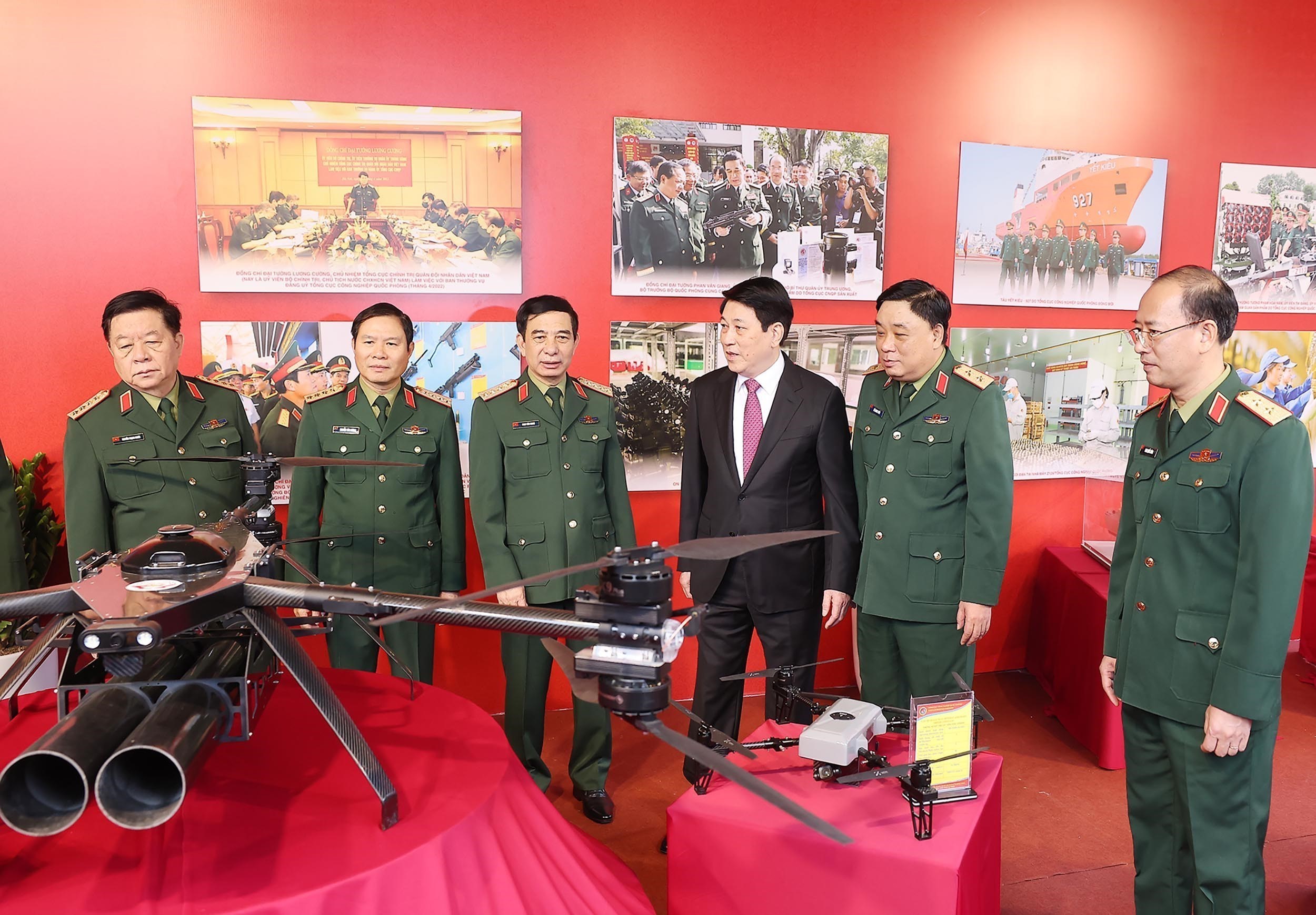 Chủ tịch nước Lương Cường và đại biểu tham quan trưng bày khí tài, thiết bị quân sự do Tổng cục Công nghiệp Quốc phòng sản xuất. Ảnh: Lâm Khánh – TTXVN