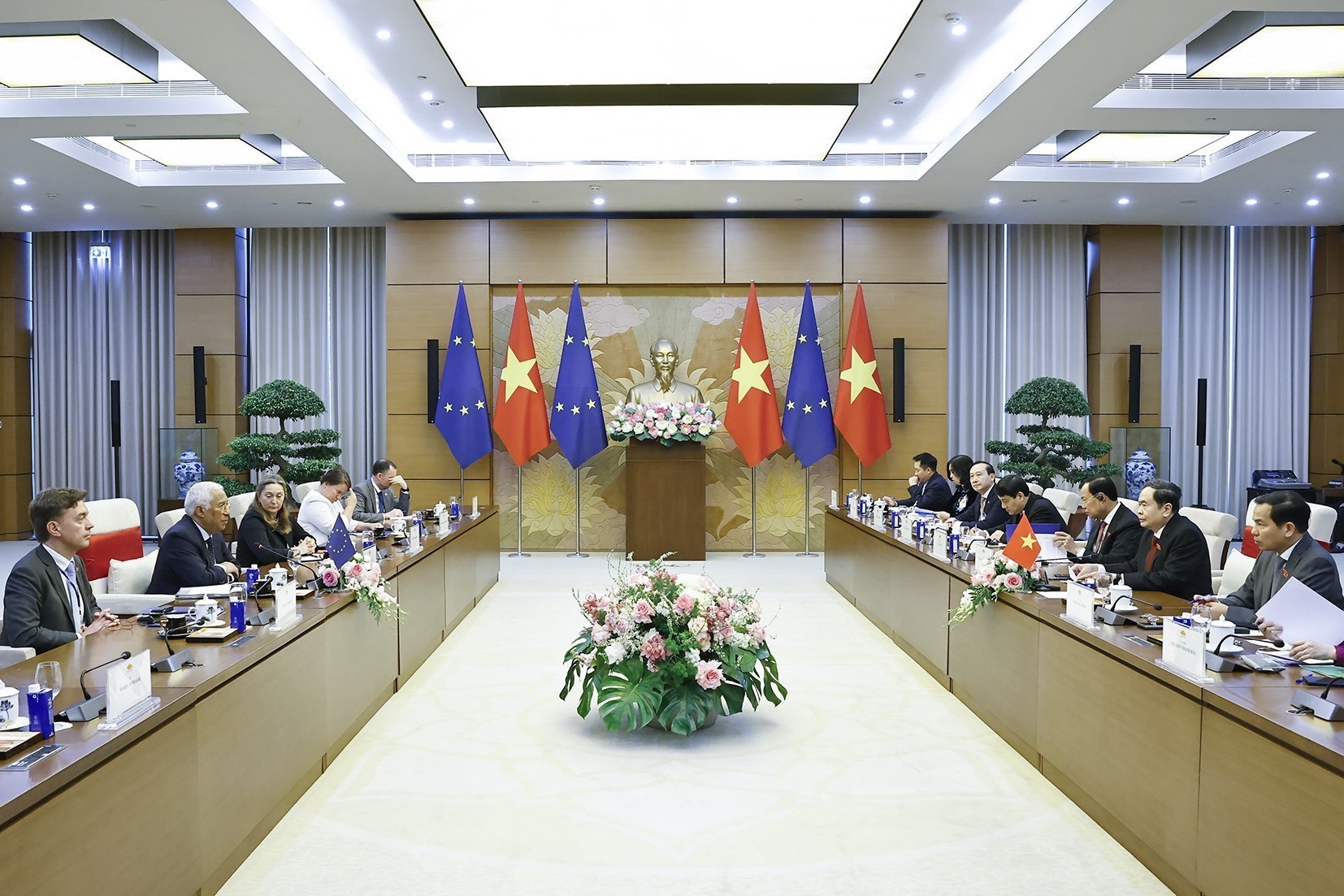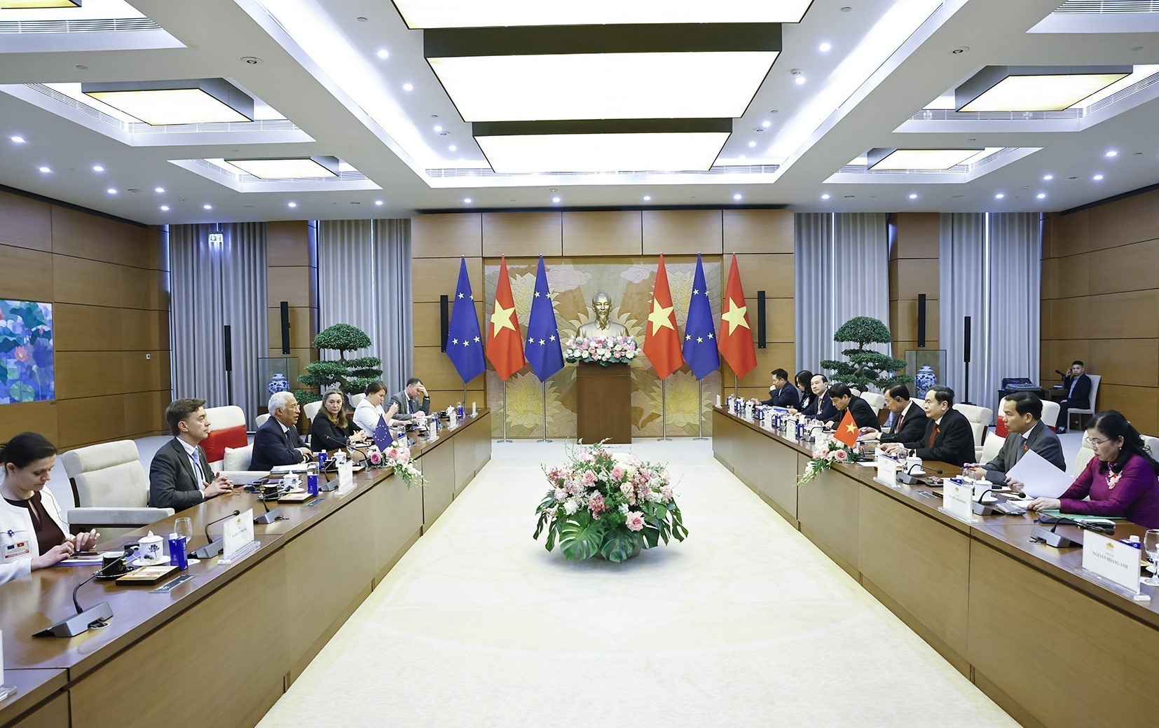 Chủ tịch Quốc hội Trần Thanh Mẫn khẳng định, Việt Nam luôn coi EU và các nước thành viên là đối tác quan trọng trong tiến trình hội nhập và phát triển đất nước; đánh giá cao sự hỗ trợ của EU, đặc biệt trong các lĩnh vực kinh tế xanh, chuyển đổi số, ứng phó với biến đổi khí hậu cũng như các dự án hạ tầng quan trọng.