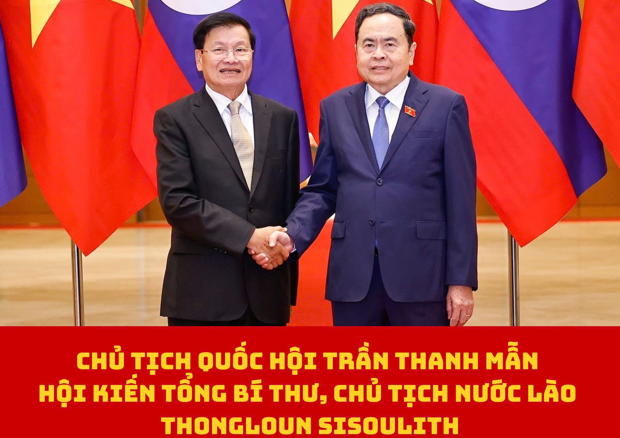 Chủ tịch Quốc hội Trần Thanh Mẫn thay mặt Quốc hội và nhân dân Việt Nam chúc mừng đồng chí Thongloun Sisoulith tiếp tục được Đảng, Nhà nước Lào tín nhiệm bầu giữ chức Tổng Bí thư Ban Chấp hành Trung ương Đảng Nhân dân Cách mạng Lào và tin tưởng sâu sắc rằng, với năng lực lãnh đạo, uy tín chính trị, bề dày kinh nghiệm thực tiễn, đồng chí Tổng Bí thư, Chủ tịch nước Lào sẽ tiếp tục có những đóng góp quan trọng, to lớn vào sự nghiệp xây dựng, bảo vệ và phát triển đất nước Lào; lãnh đạo Đảng, Nhà nước và nhân dân Lào thực hiện thắng lợi Nghị quyết Đại hội XII của Đảng Nhân dân Cách mạng Lào và Kế hoạch phát triển kinh tế - xã hội 5 năm lần thứ 10 (giai đoạn 2026 - 2030), qua đó không ngừng nâng cao vị thế, uy tín của nước Cộng hòa Dân chủ Nhân dân Lào trong khu vực và trên thế giới.