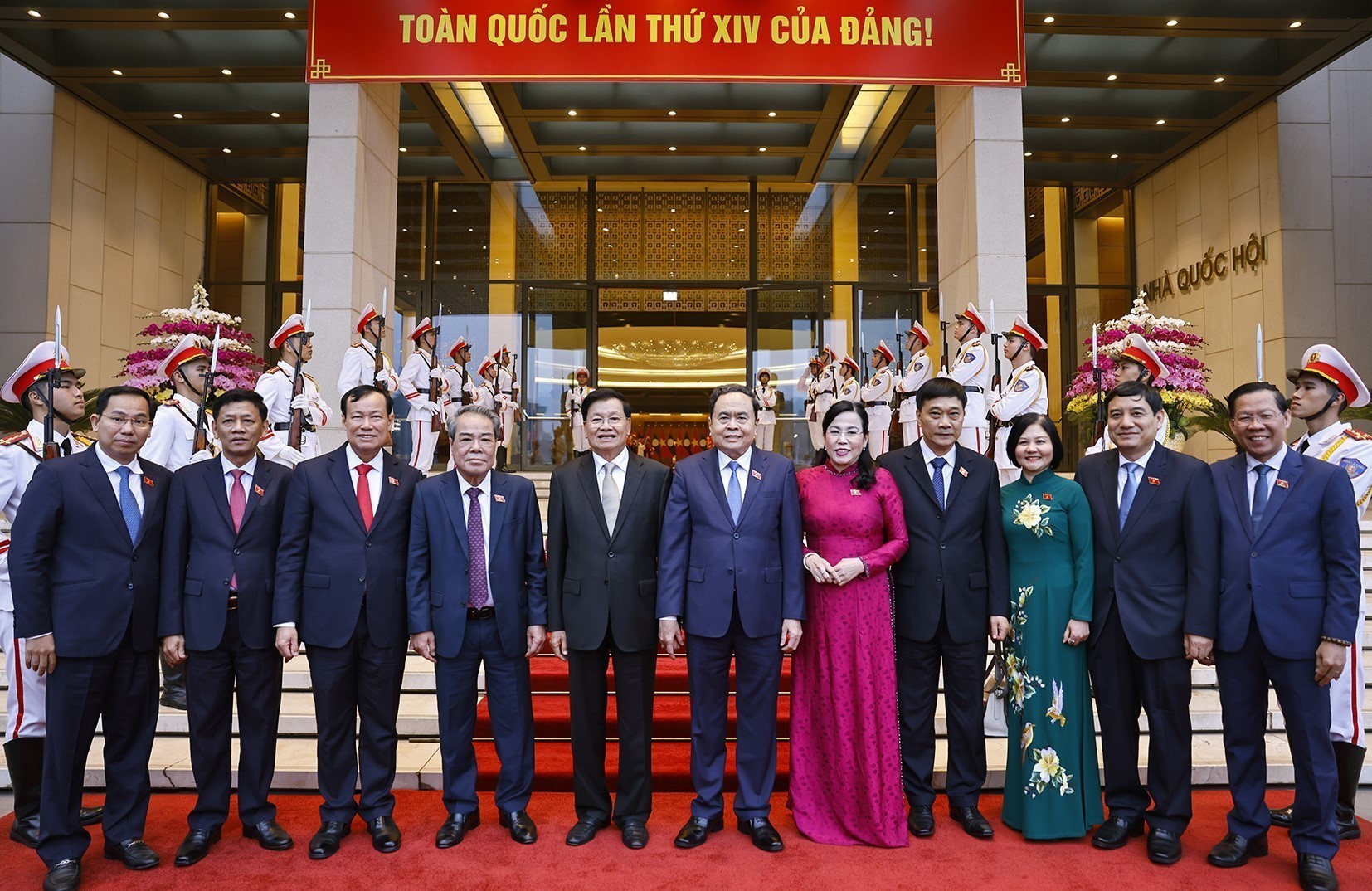 Chủ tịch Quốc hội Trần Thanh Mẫn và Tổng Bí thư, Chủ tịch nước Lào Thongloun Sisoulith với đại biểu đoàn Việt Nam. Ảnh: Doãn Tấn – TTXVN