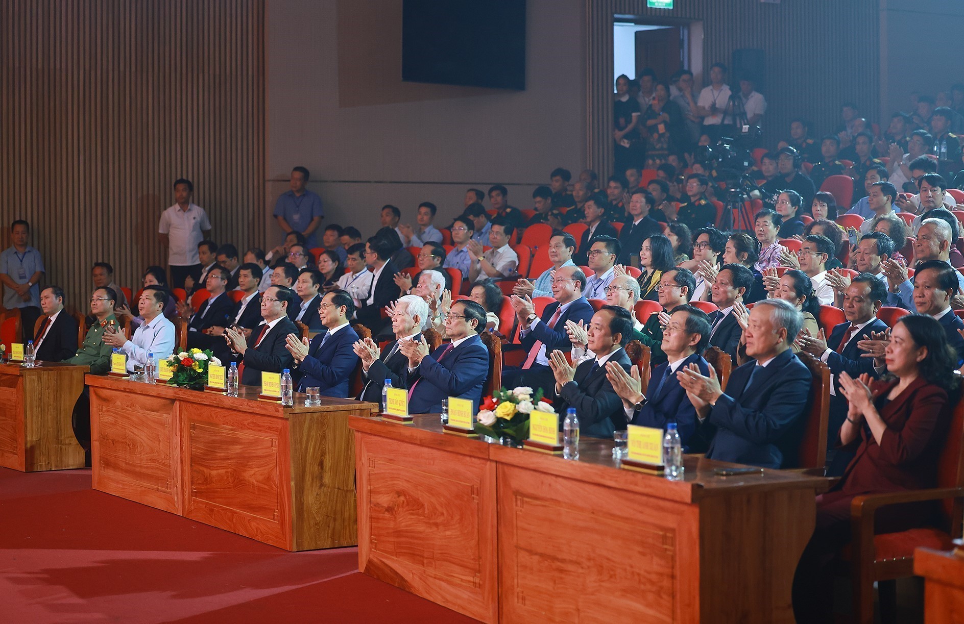 Thủ tướng Phạm Minh Chính và các đồng chí lãnh đạo, nguyên lãnh đạo Đảng, Nhà nước dự Chương trình nghệ thuật chính luận “Thủ tướng Phạm Văn Đồng - trọn đời vì nước, vì dân”. Ảnh: Dương Giang-TTXVN