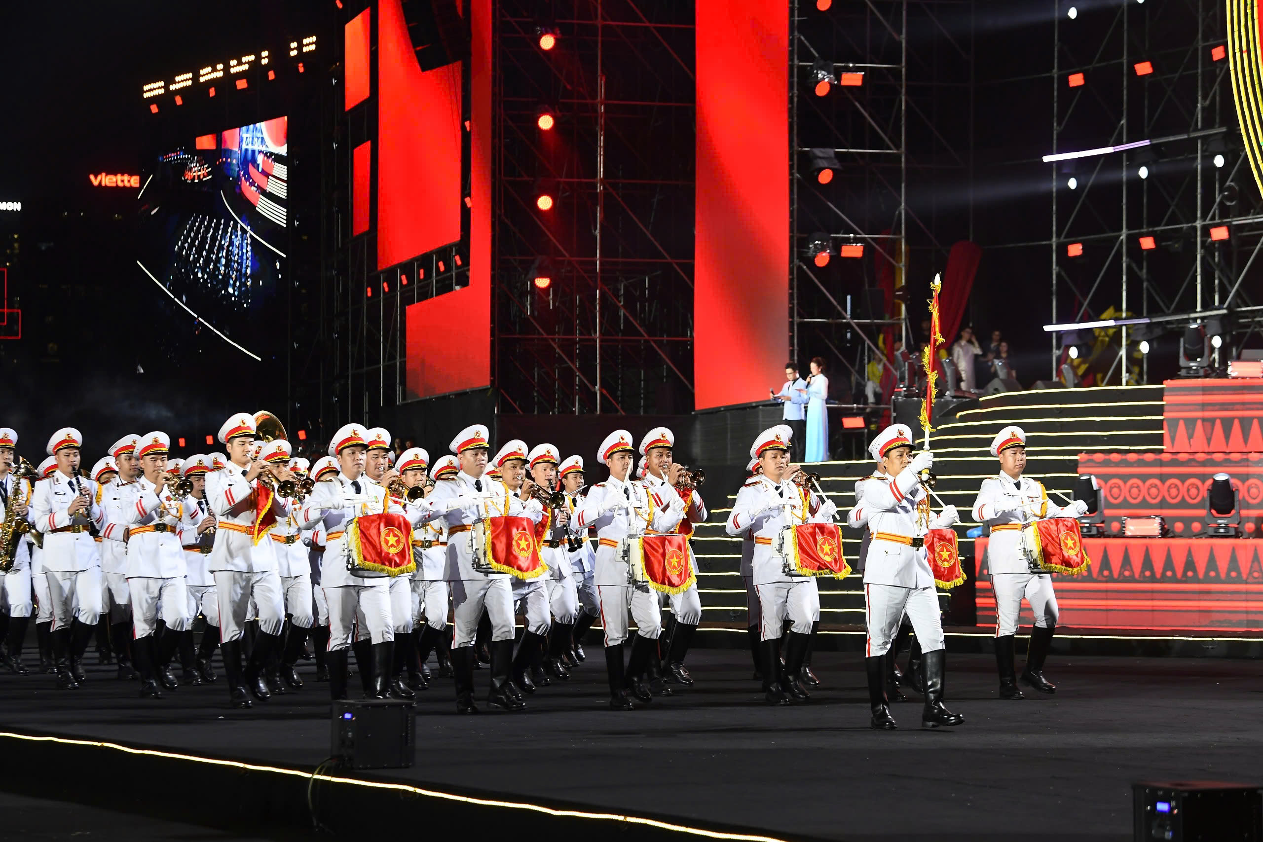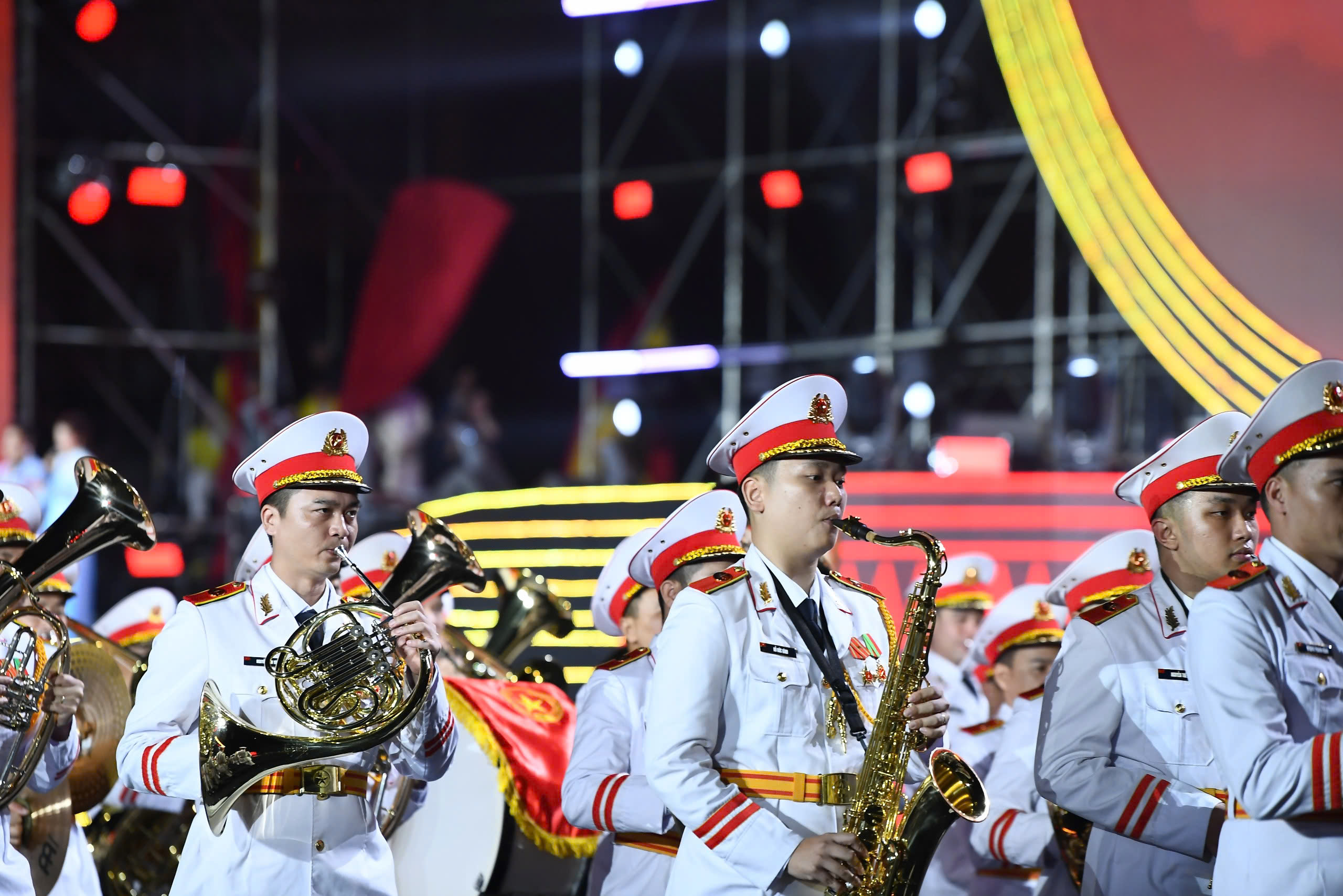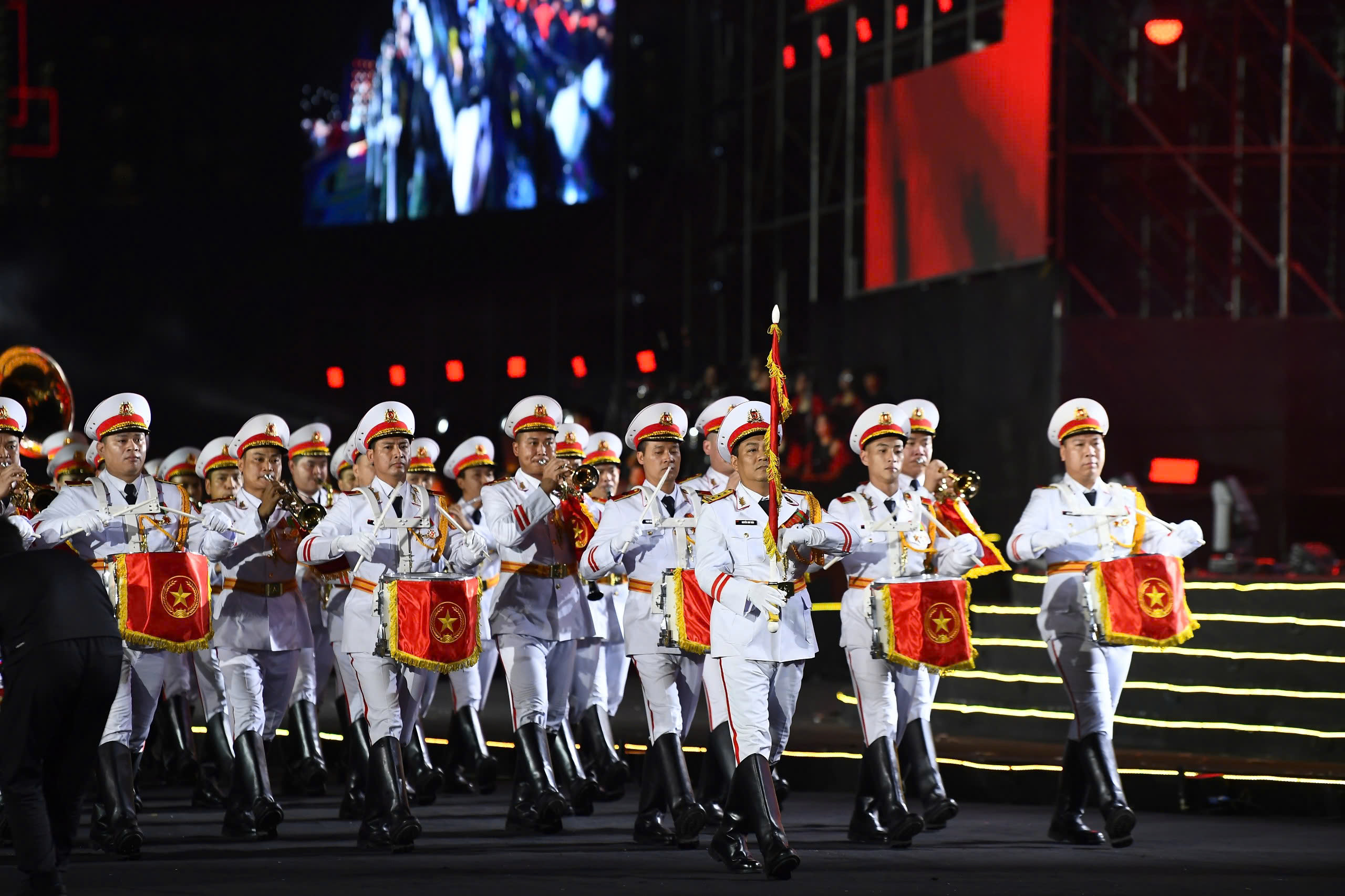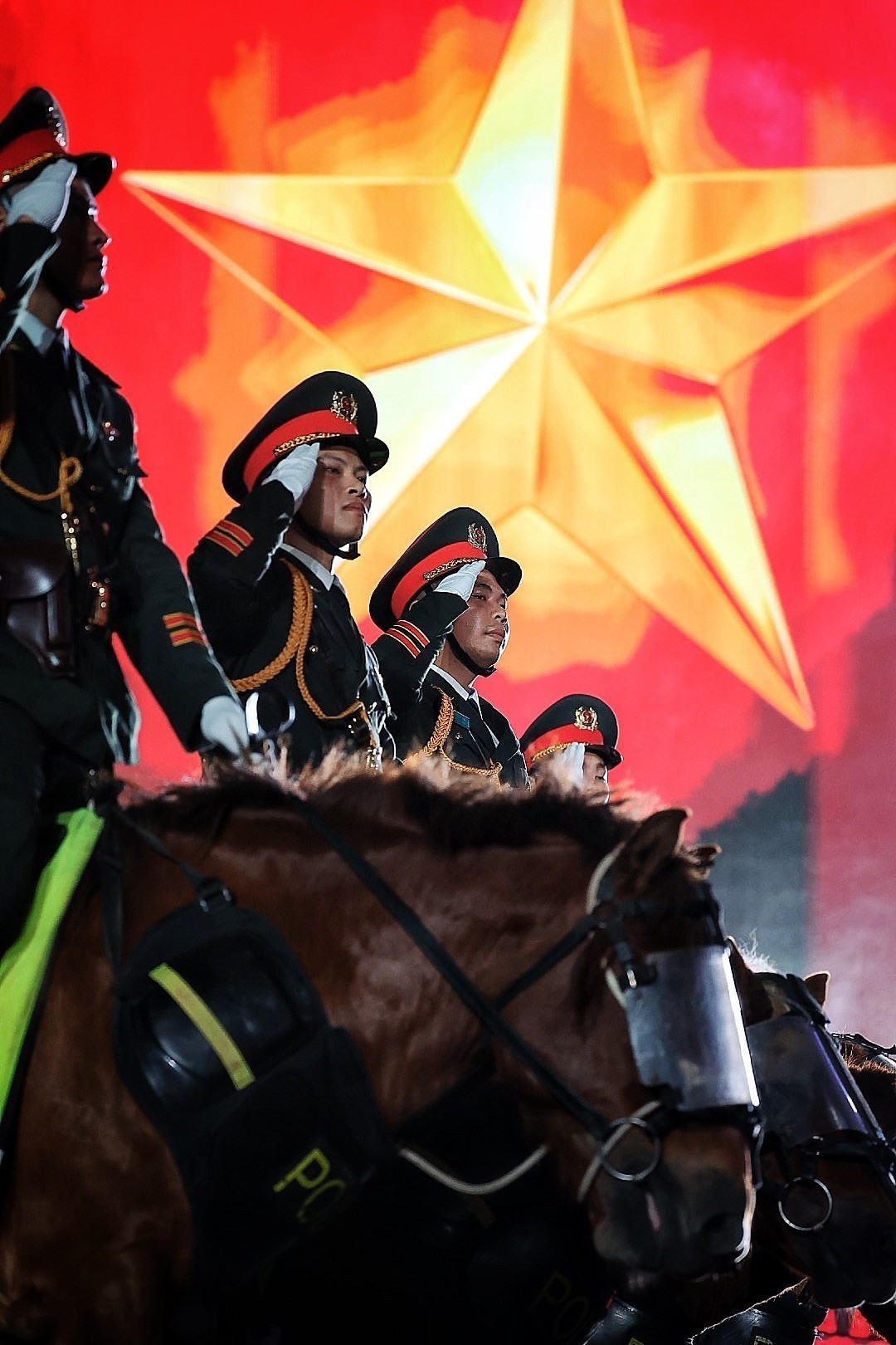 Cùng lúc đó, sự tham gia đồng diễn của 1.000 quân nhân, 500 chiến sĩ công an, lực lượng kỵ binh đã tạo ra một trong những màn trình diễn ấn tượng nhất. Sự cộng hưởng giữa con người, kỷ luật quân đội và công nghệ ánh sáng mang lại một không gian biểu diễn trang trọng, oai hùng, đan xen hơi thở đương đại tươi mới.