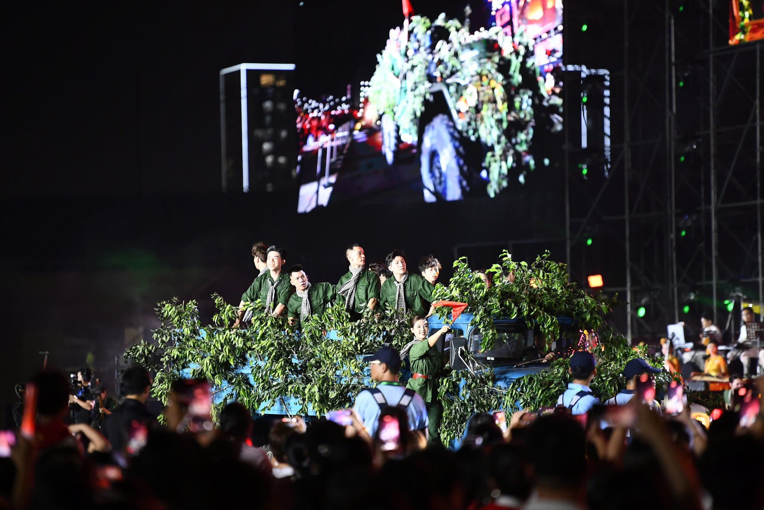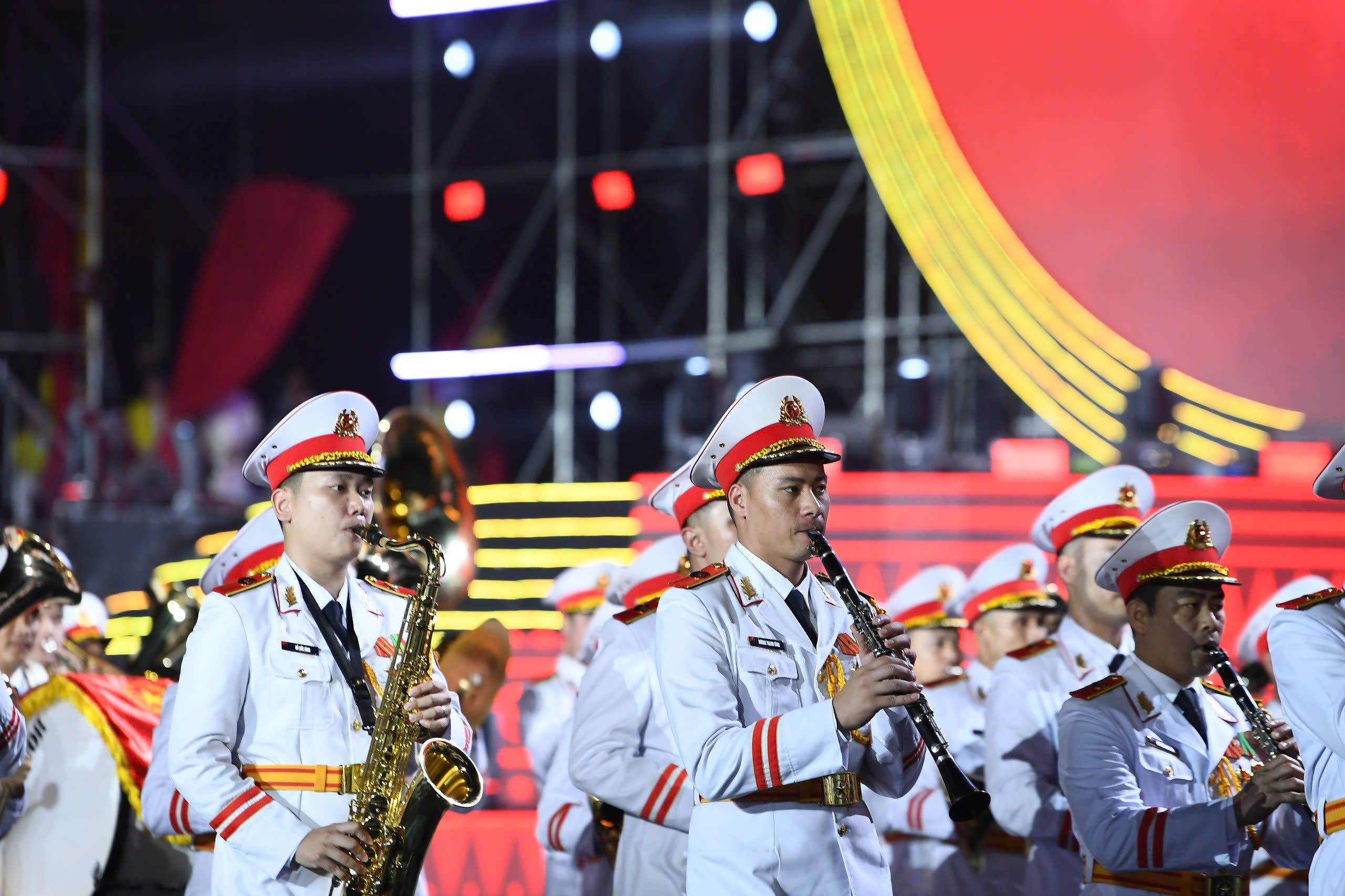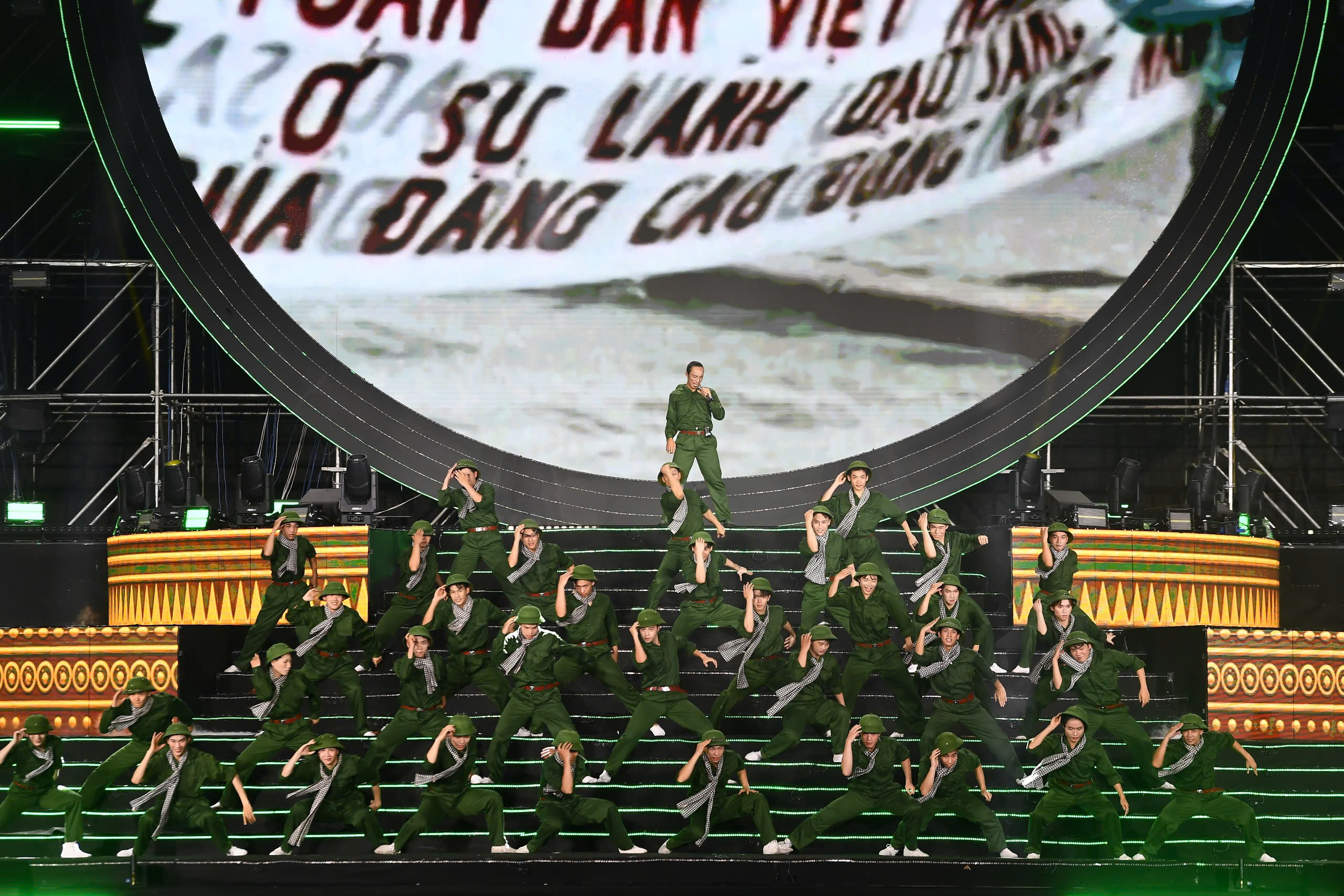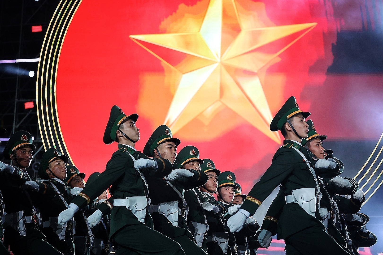 Cùng lúc đó, sự tham gia đồng diễn của 1.000 quân nhân, 500 chiến sĩ công an, lực lượng kỵ binh đã tạo ra một trong những màn trình diễn ấn tượng nhất. Sự cộng hưởng giữa con người, kỷ luật quân đội và công nghệ ánh sáng mang lại một không gian biểu diễn trang trọng, oai hùng, đan xen hơi thở đương đại tươi mới.