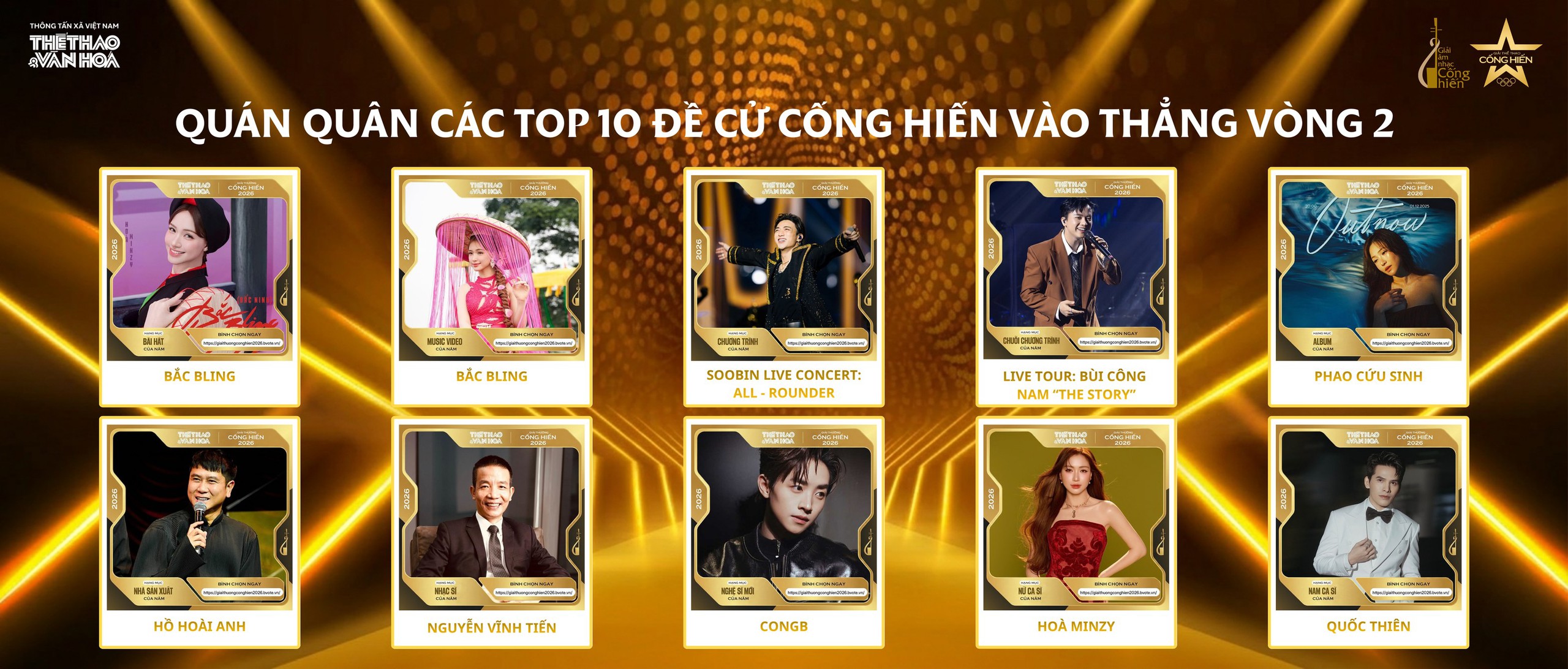 Danh sách các TOP 5 ĐỀ CỬ CHÍNH THỨC của Giải Âm Cống hiến 2026 gồm 50 đề cử trên 10 hạng mục. Danh sách này đã bao gồm 10 "quán quân" Vòng Bình chọn đề cử trên hệ thống BVOTE: https://giaithuongconghien2026.bvote.vn vừa qua.