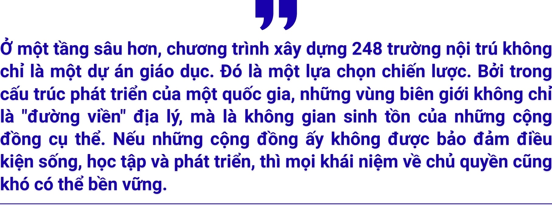 Và có lẽ, ý nghĩa lớn nhất của chương trình này nằm ở chỗ: nó cho thấy một cách tiếp cận phát triển không bỏ lại phía sau những vùng khó khăn nhất. Khi những đứa trẻ nơi biên cương được học hành đầy đủ, được nuôi dưỡng trong môi trường nhân ái và có cơ hội phát triển bình đẳng, thì tương lai của đất nước cũng được mở rộng theo một cách bền vững hơn.