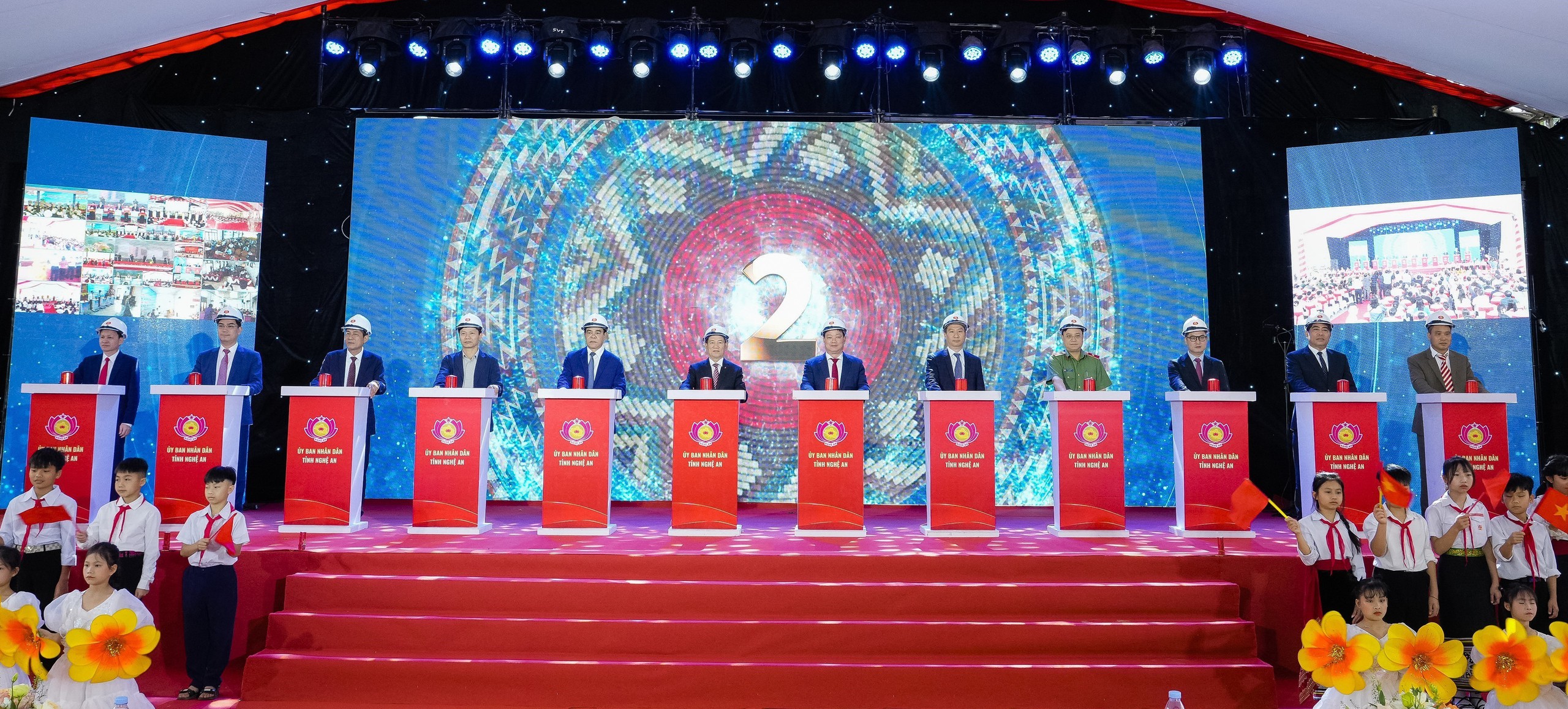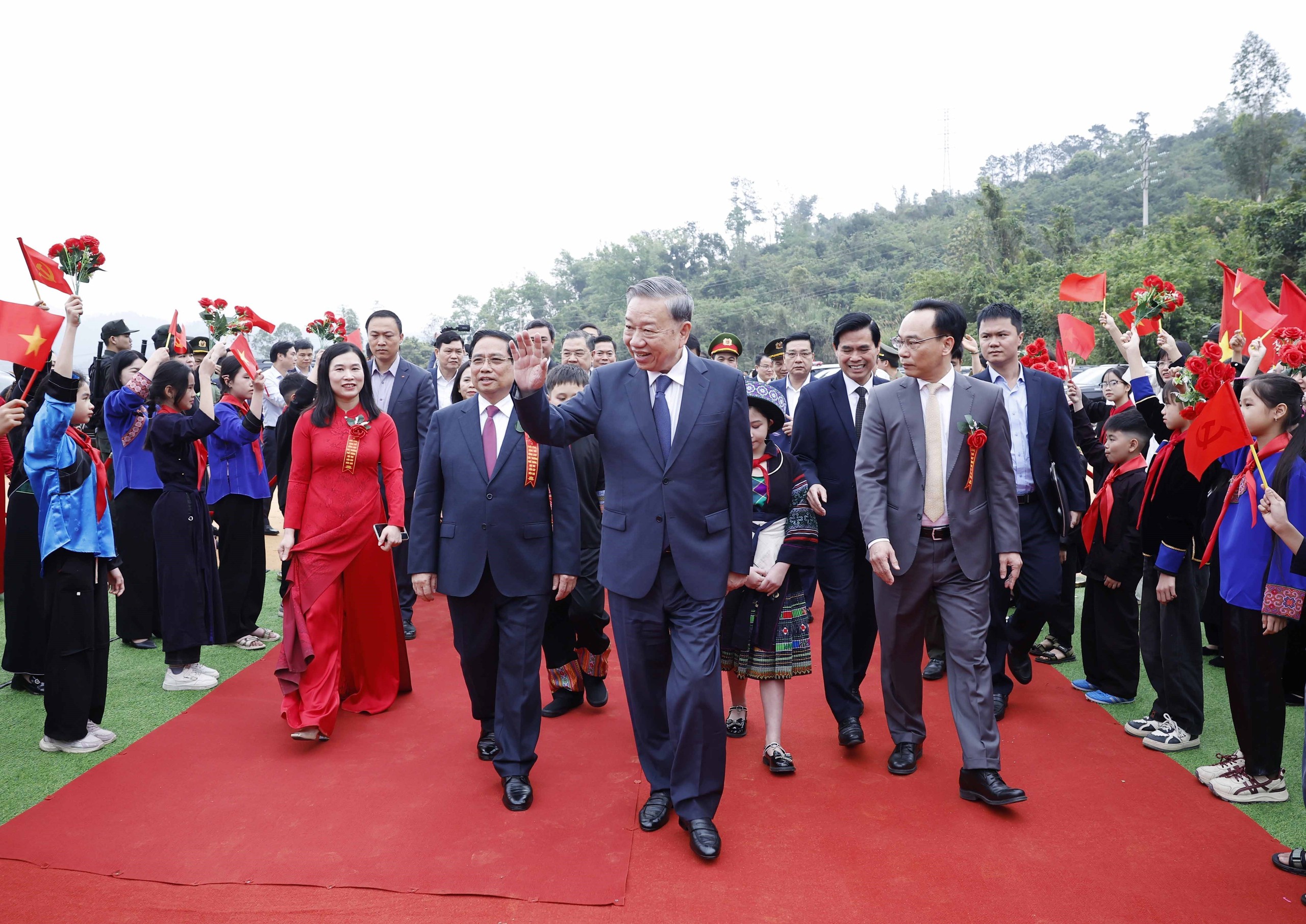 Tổng Bí thư Tô Lâm, Thủ tướng Phạm Minh Chính và các đại biểu thực hiện nghi thức khởi công, động thổ đồng loạt các trường nội trú liên cấp biên giới