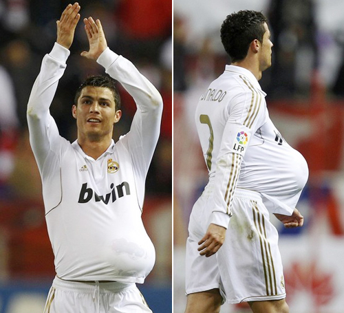 Anh đã lấy bóng bỏ vào áo tạo dáng bụng bầu, một kiểu ăn mừng mà các ông bố chuẩn bị đón tin vui thường hay thể hiện