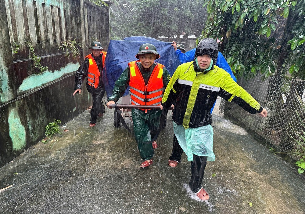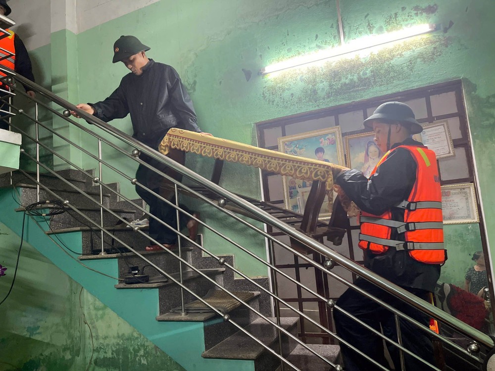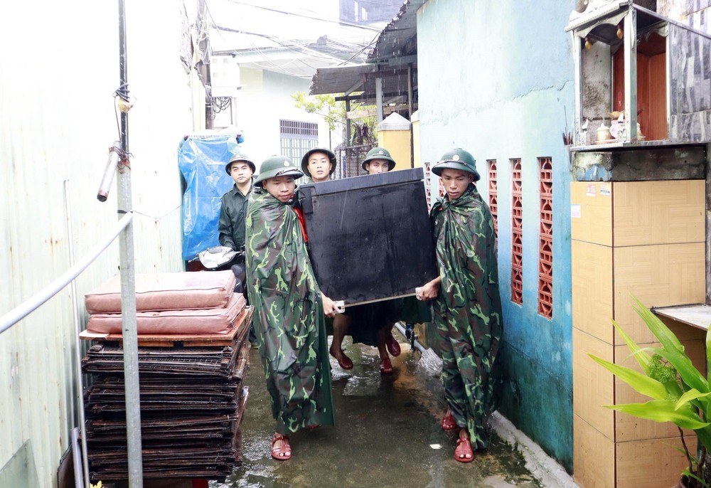 Lực lượng bộ đội và dân quân xã Duy Xuyên, thành phố Đà Nẵng giúp dân di chuyển đồ đạc lên cao. Ảnh: Trần Tĩnh - TTXVN