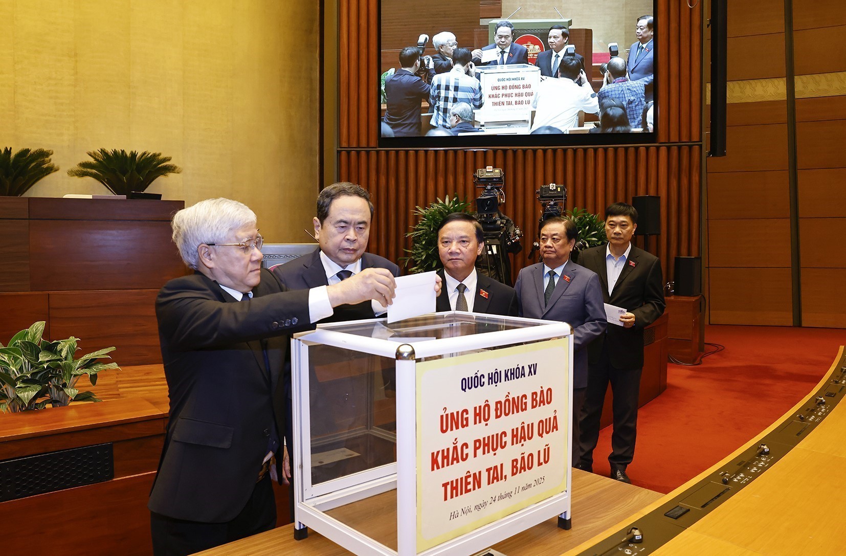 Sáng 24/11/2025, tại Kỳ họp thứ 10, Quốc hội khoá XV, đại biểu Quốc hội quyên góp ủng hộ đồng bào khắc phục hậu quả thiên tai, bão lũ. Chương trình do Ủy ban Thường vụ Quốc hội tổ chức.