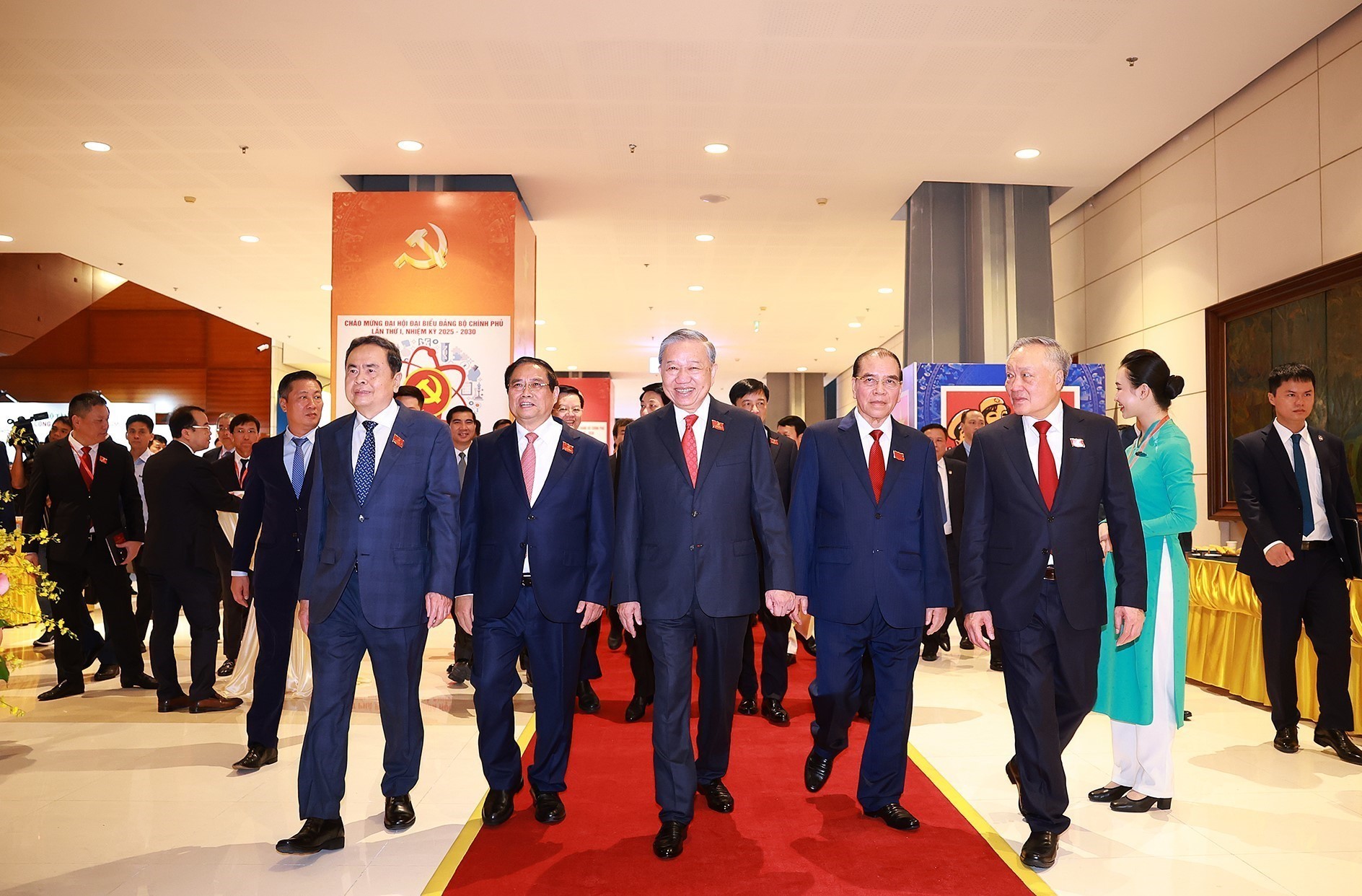 Tổng Bí thư Tô Lâm và các đồng chí lãnh đạo Đảng, Nhà nước đến dự Đại hội đại biểu Đảng bộ Chính phủ lần thứ I, nhiệm kỳ 2025-2030. Ảnh: Dương Giang-TTXVN