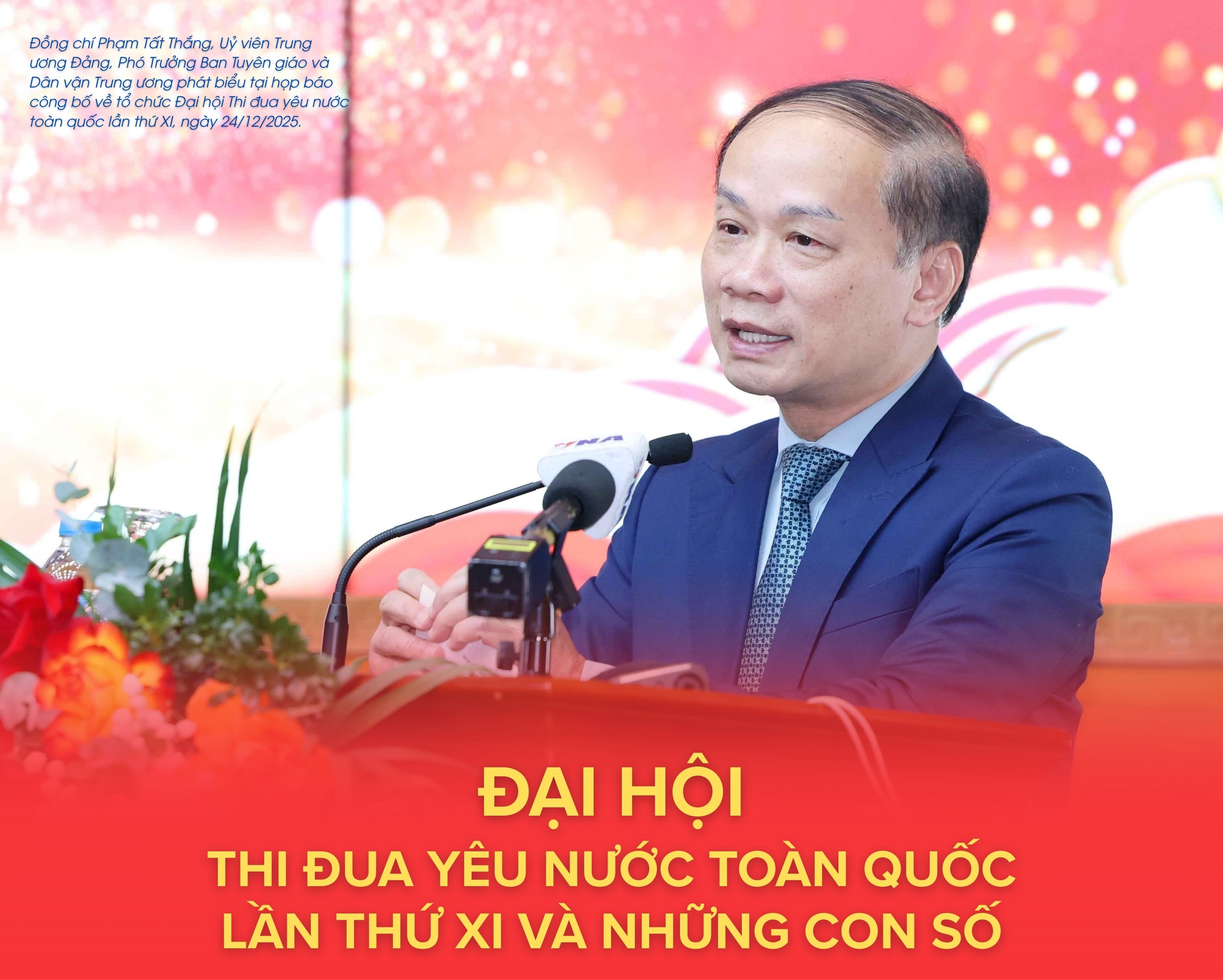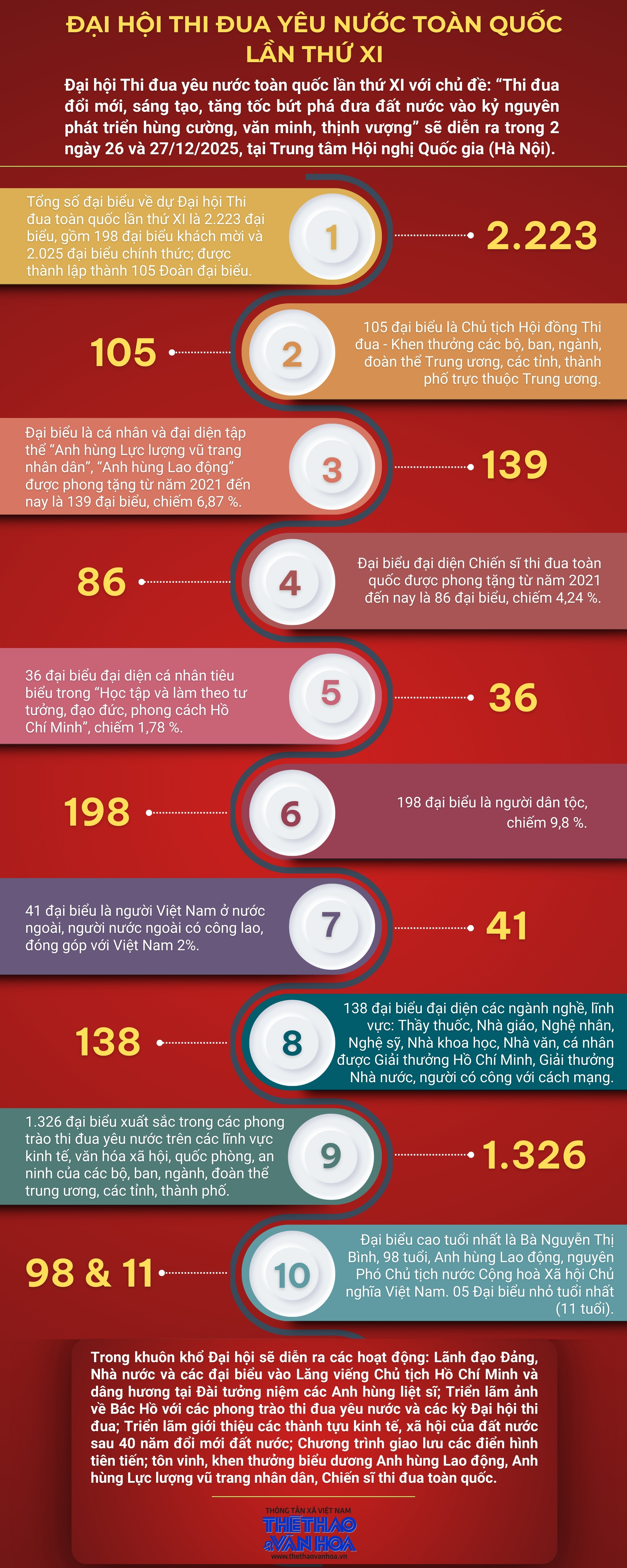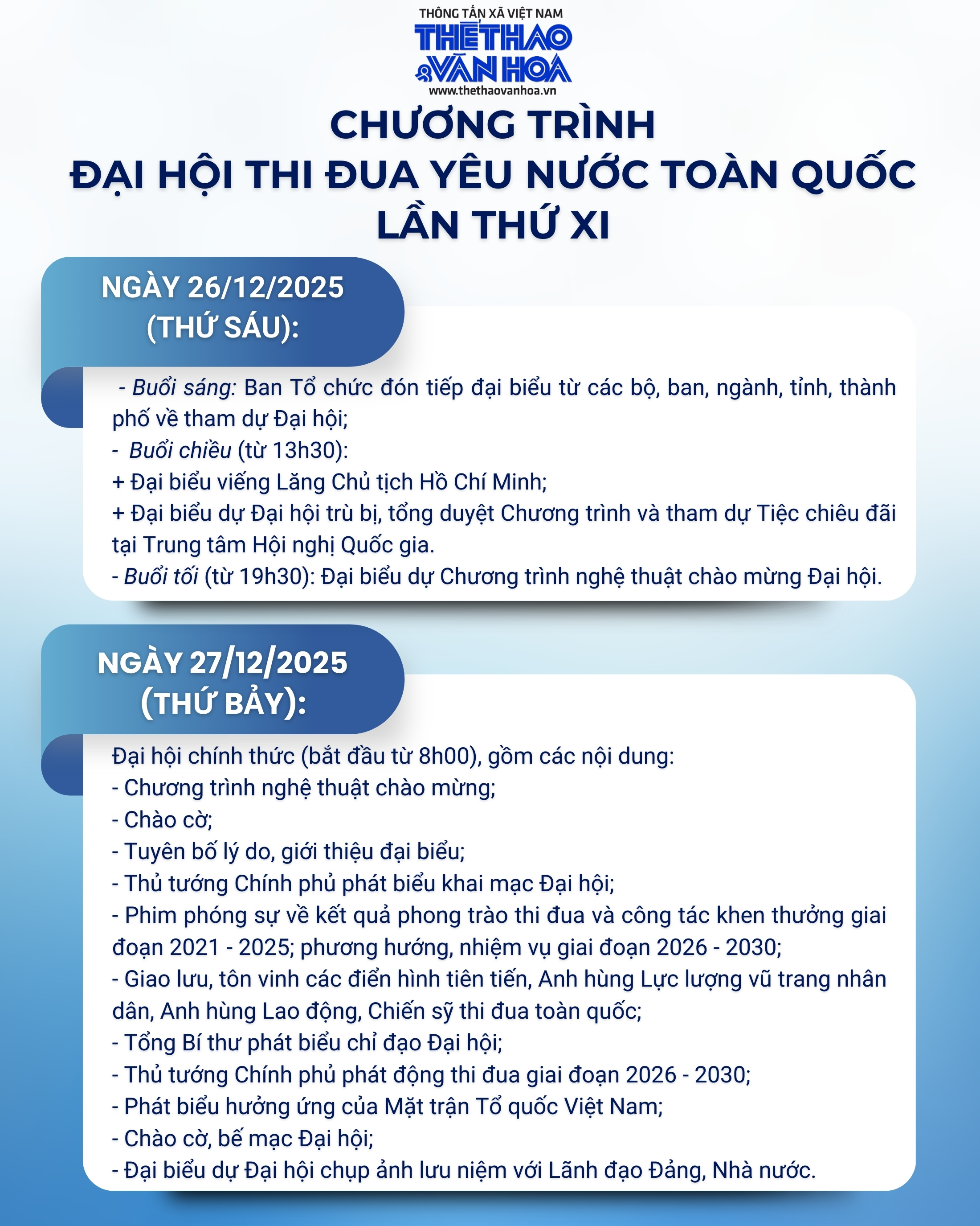 Với chủ đề "Thi đua đổi mới, sáng tạo, tăng tốc bứt phá đưa đất nước vào kỷ nguyên phát triển hùng cường, văn minh, thịnh vượng", Đại hội Thi đua yêu nước toàn quốc lần thứ XI sẽ diễn ra trong 2 ngày 26 và 27/12/2025 tại Trung tâm Hội nghị Quốc gia (Hà Nội).