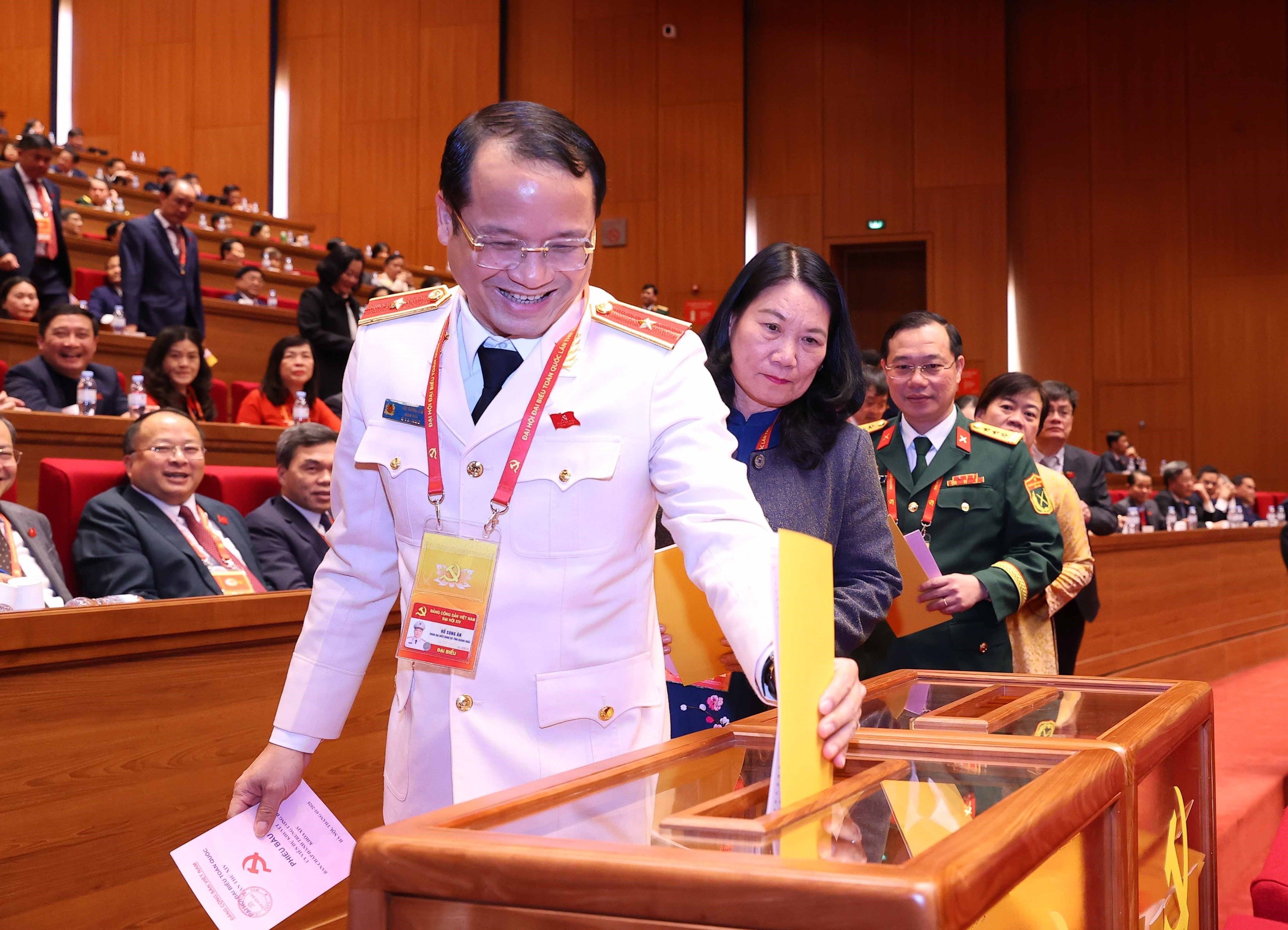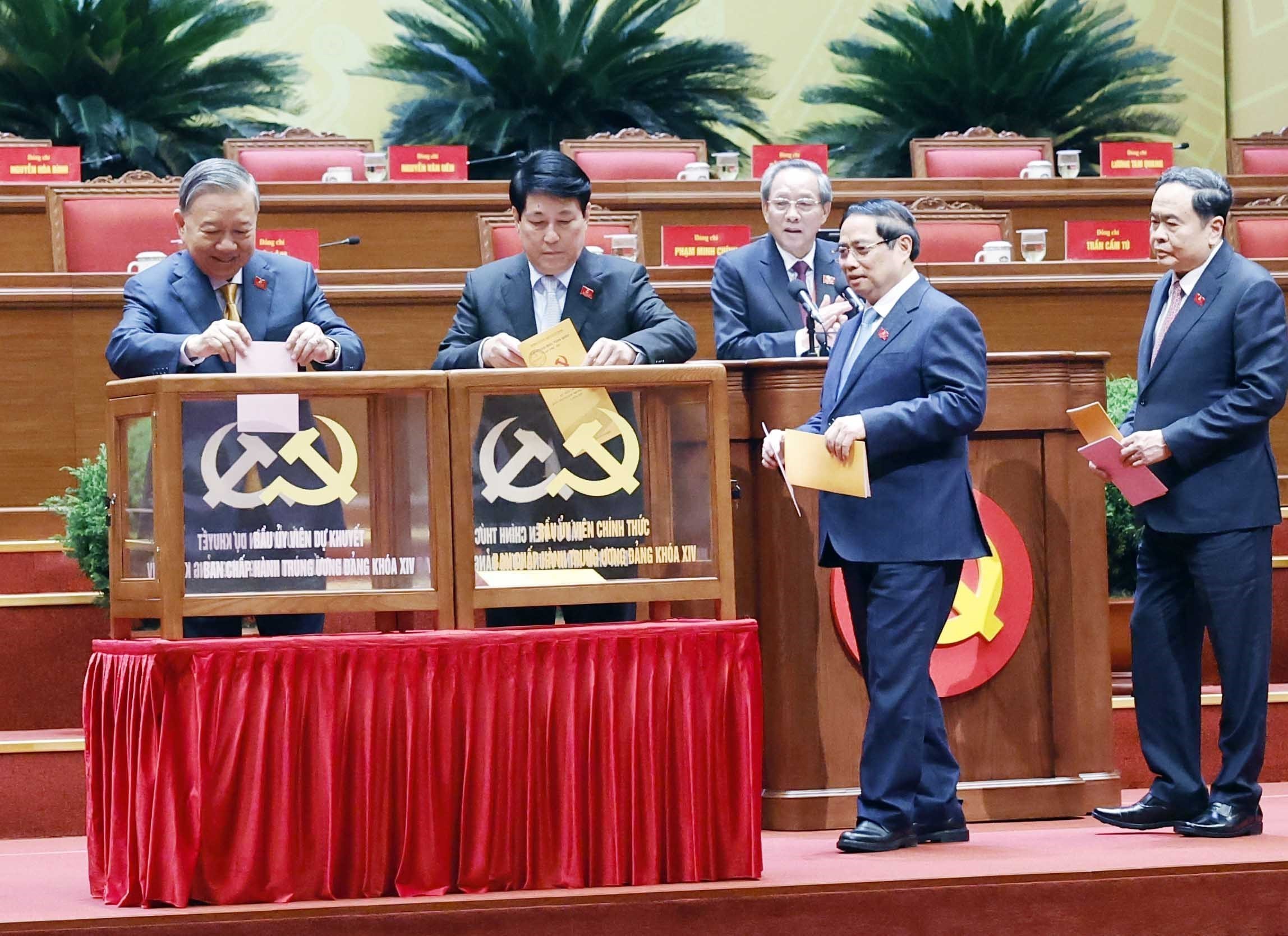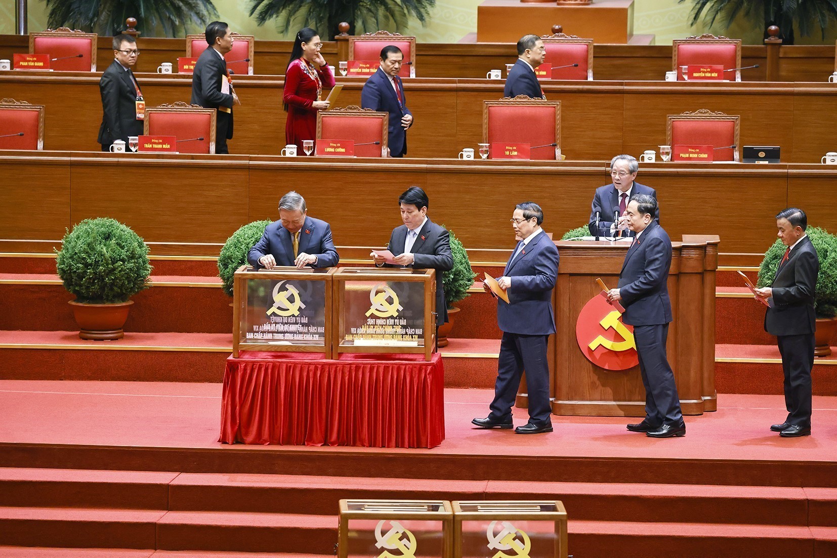 Tổng Bí thư Tô Lâm cùng các đồng chí lãnh đạo Đảng và Nhà nước bỏ phiếu bầu Ủy viên Trung ương chính chức và Ủy viên dự khuyết Ban Chấp hành Trung ương Đảng khóa XIV