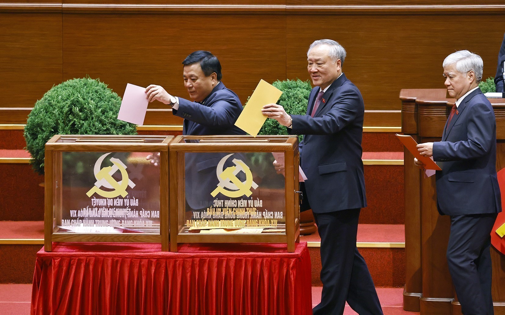 Các đồng chí lãnh đạo Đảng và Nhà nước bỏ phiếu bầu Ban Chấp hành Trung ương Đảng khóa XIV. Ảnh: TTXVN