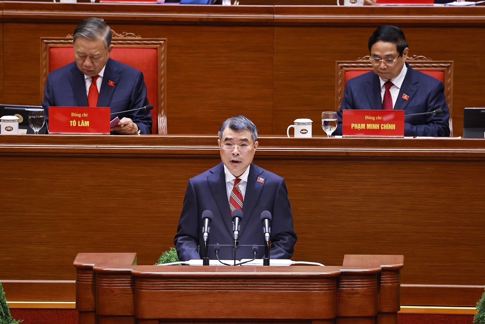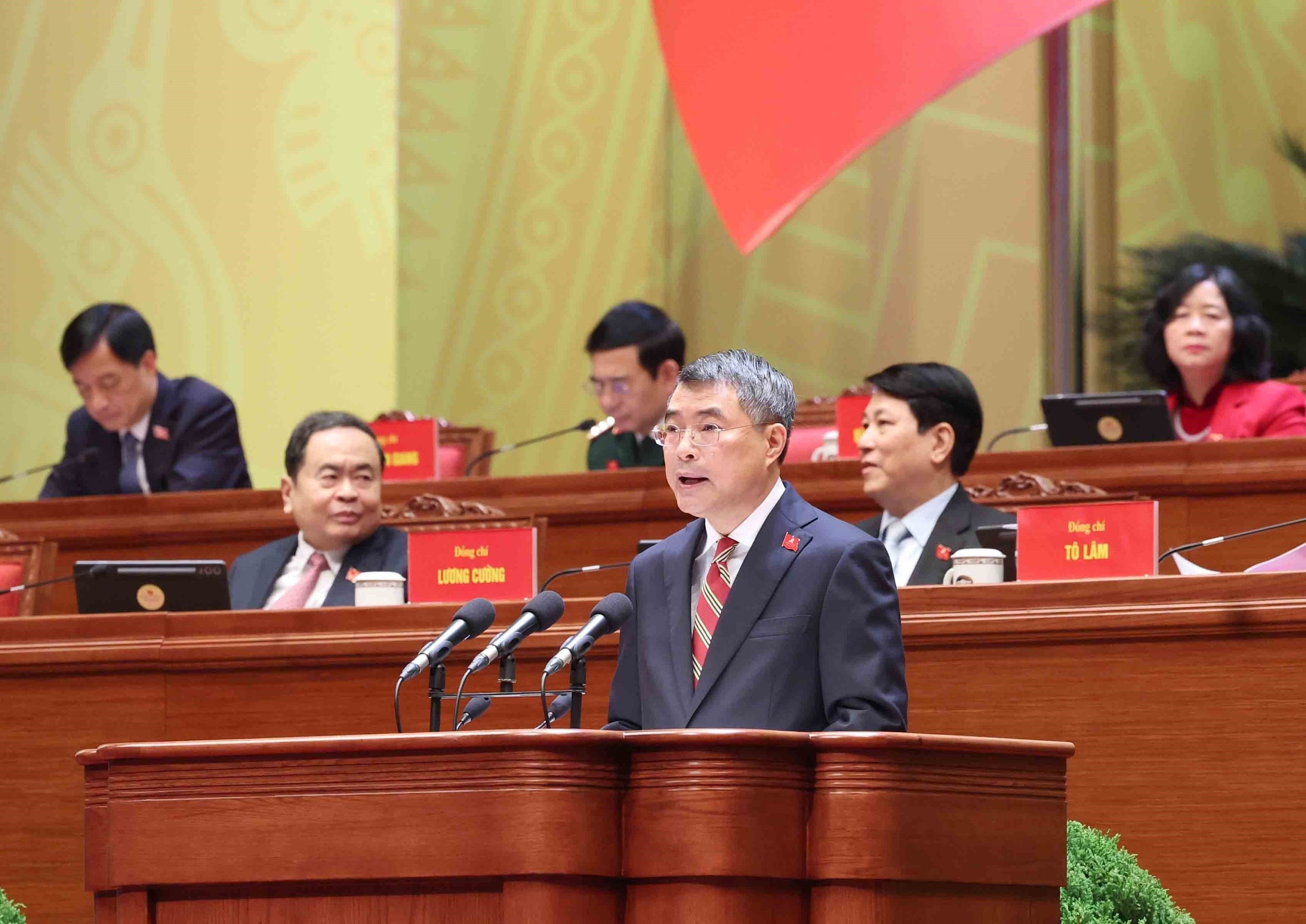 Đồng chí Lê Minh Hưng, Ủy viên Bộ Chính trị, Bí thư Trung ương Đảng, Trưởng Ban Tổ chức Trung ương thay mặt Đoàn Chủ tịch trình bày Báo cáo của BCH Trung ương Đảng khóa XIII về công tác nhân sự BCH Trung ương Đảng khóa XIV. Ảnh: TTXVN