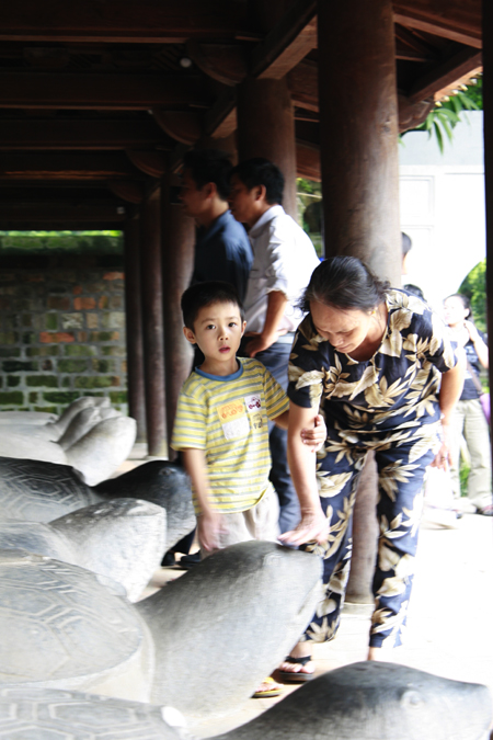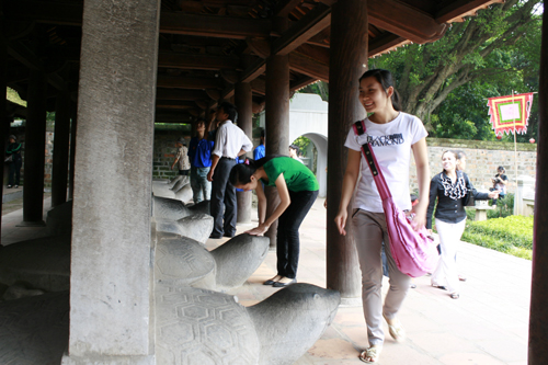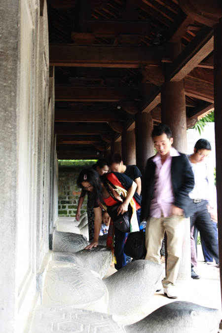 Trong khi đó, ở bia đá tiến sĩ, cũng đã có lực lượng sinh viên tình nguyện đứng bảo vệ không cho sờ đầu rùa đá thì rất nhiều người đã tranh thủ sờ trộm lúc đông người hoặc thậm chí có người còn sẵn sàng… ôm cổ rùa đá để tạo dáng.