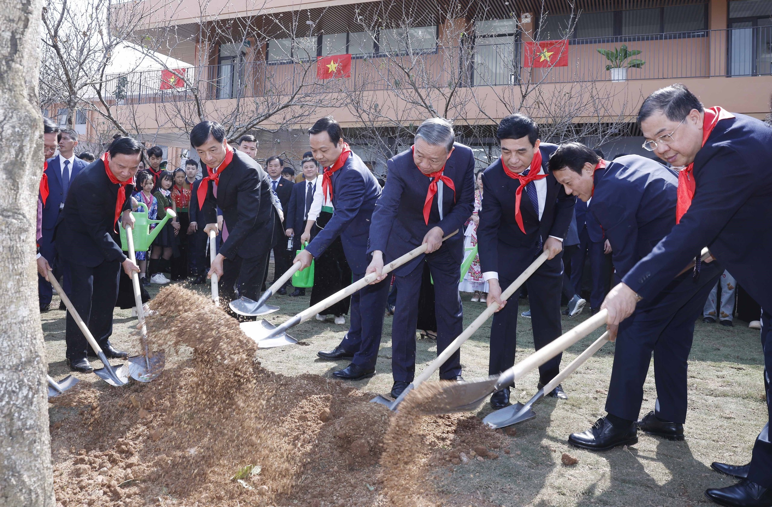 Tổng Bí thư Tô Lâm và Đoàn công tác của Trung ương trồng cây lưu niệm tại Trường PT Nội trú liên cấp Tiểu học và THCS Si Pa Phìn