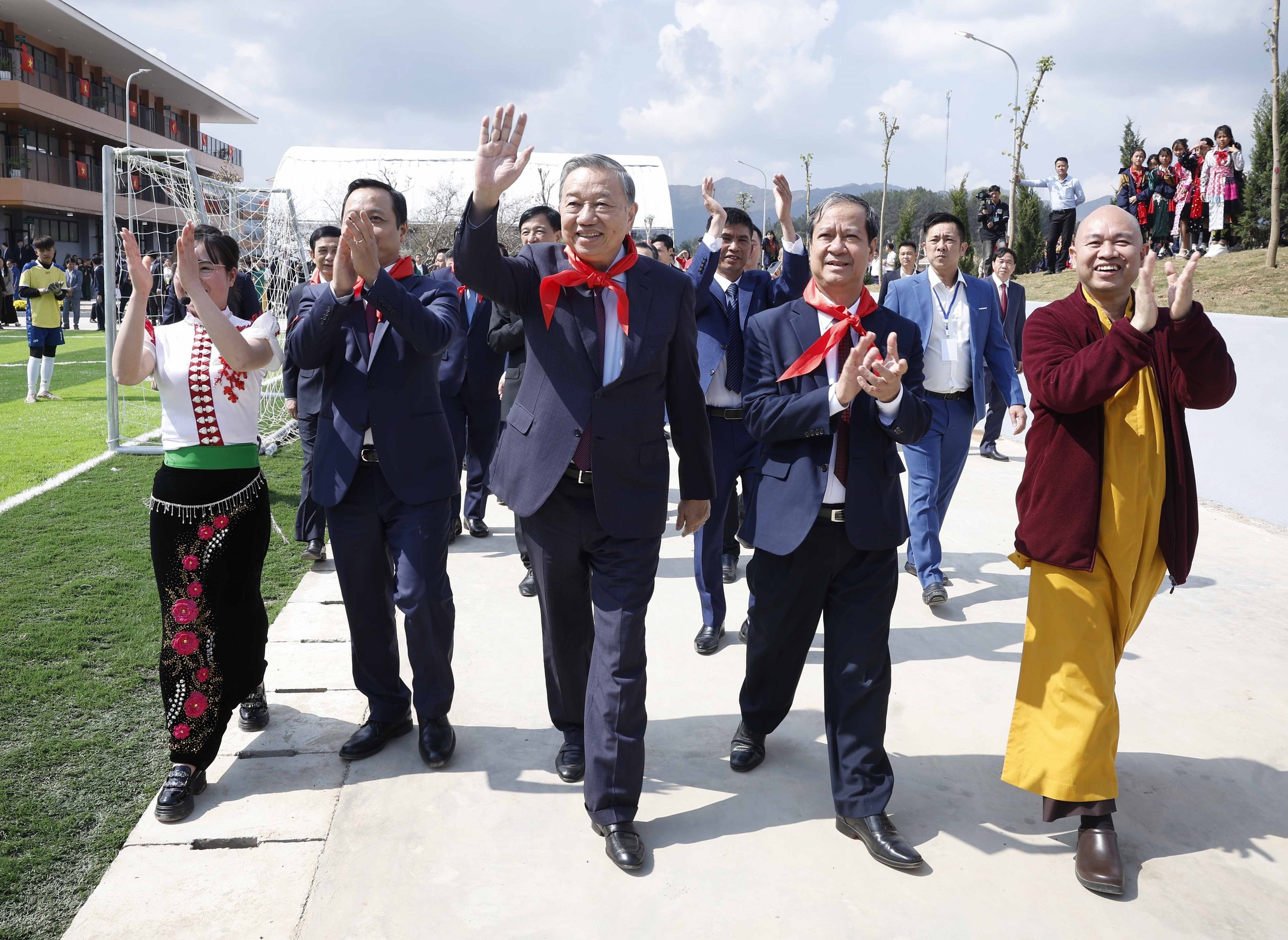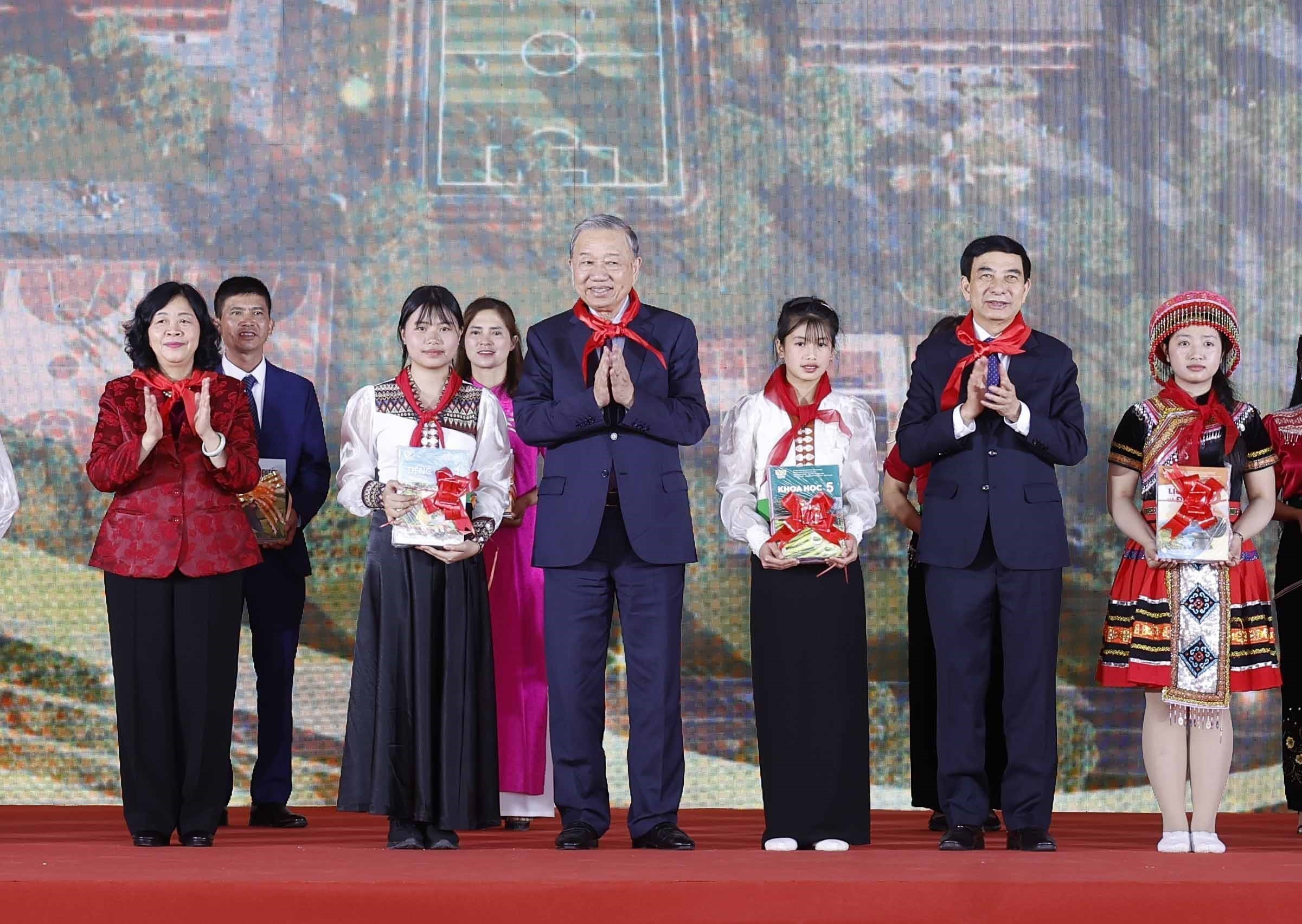 Tổng Bí thư Tô Lâm và đại biểu thực hiện nghi thức khánh thành Trường Phổ thông nội trú liên cấp Tiểu học và THCS Si Pa Phìn