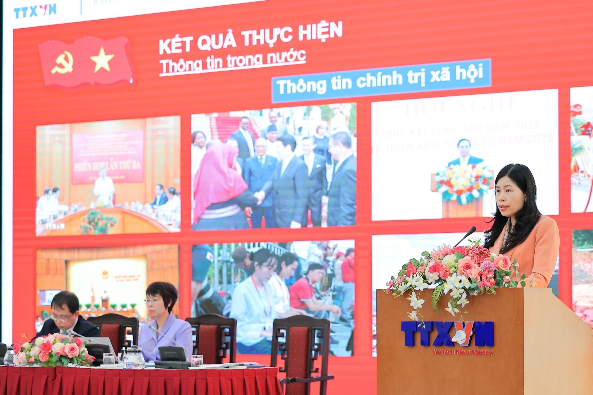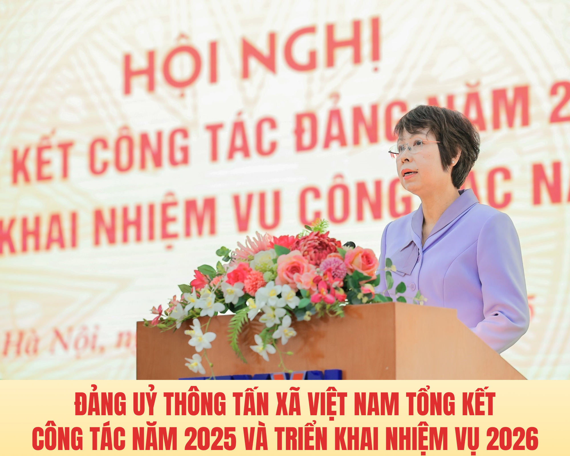 Đ/c Đỗ Thị Trang, Phó Bí thư Chuyên trách Đảng ủy TTXVN trình bày Báo cáo tóm tắt công tác đảng năm 2025 và triển khai nhiệm vụ công tác năm 2026. Ảnh: Lê Đông - TTXVN