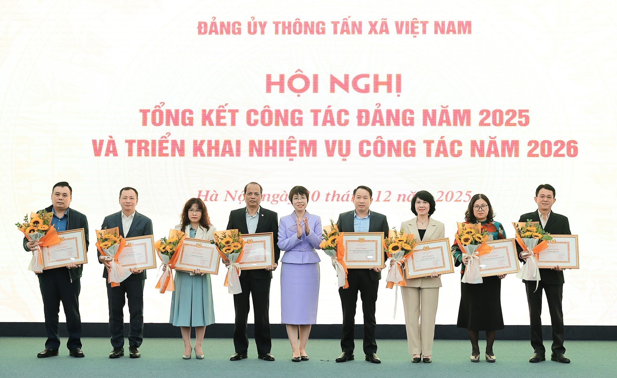 Đ/c Vũ Việt Trang, Ủy viên Ban Chấp hành Đảng bộ Chính phủ, Bí thư Đảng ủy, Tổng Giám đốc TTXVN trao Giấy khen cho 8 tổ chức Đảng hoàn thành xuất sắc nhiệm vụ năm 2025. Ảnh: Lê Đông - TTXVN