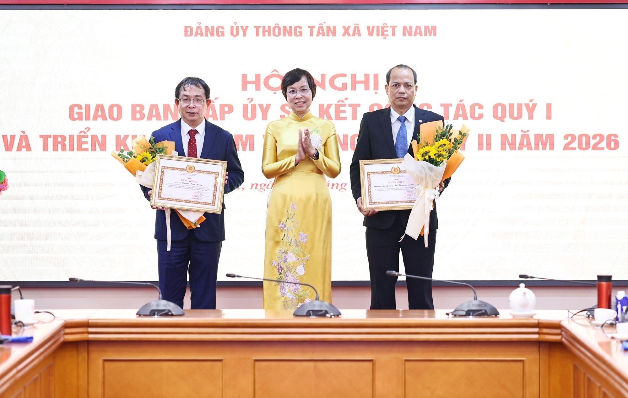 Đồng chí Vũ Việt Trang, Ủy viên BCH Đảng bộ Chính phủ, Bí thư Đảng ủy, Tổng giám đốc TTXVN trao Bằng khen của Đảng ủy Chính phủ cho đồng chí Nguyễn Tuấn Hùng, Phó Bí thư Thường trực Đảng ủy, Phó Tổng giám đốc TTXVN và Đảng bộ Ban biên tập Ảnh trực thuộc Đảng bộ TTXVN có thành tích tiêu biểu trong công tác lãnh đạo, chỉ đạo, tham mưu tổ chức Đại hội đại biểu Đảng bộ Chính phủ lần thứ nhất, nhiệm kỳ 2025 - 2030