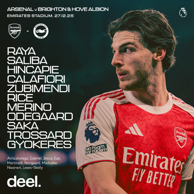 Arsenal: Raya; Timber, Saliba, Calafiori, Lewis-Skelly; Zubimendi, Rice, Odegaard; Saka, Gyokeres, Martinelli