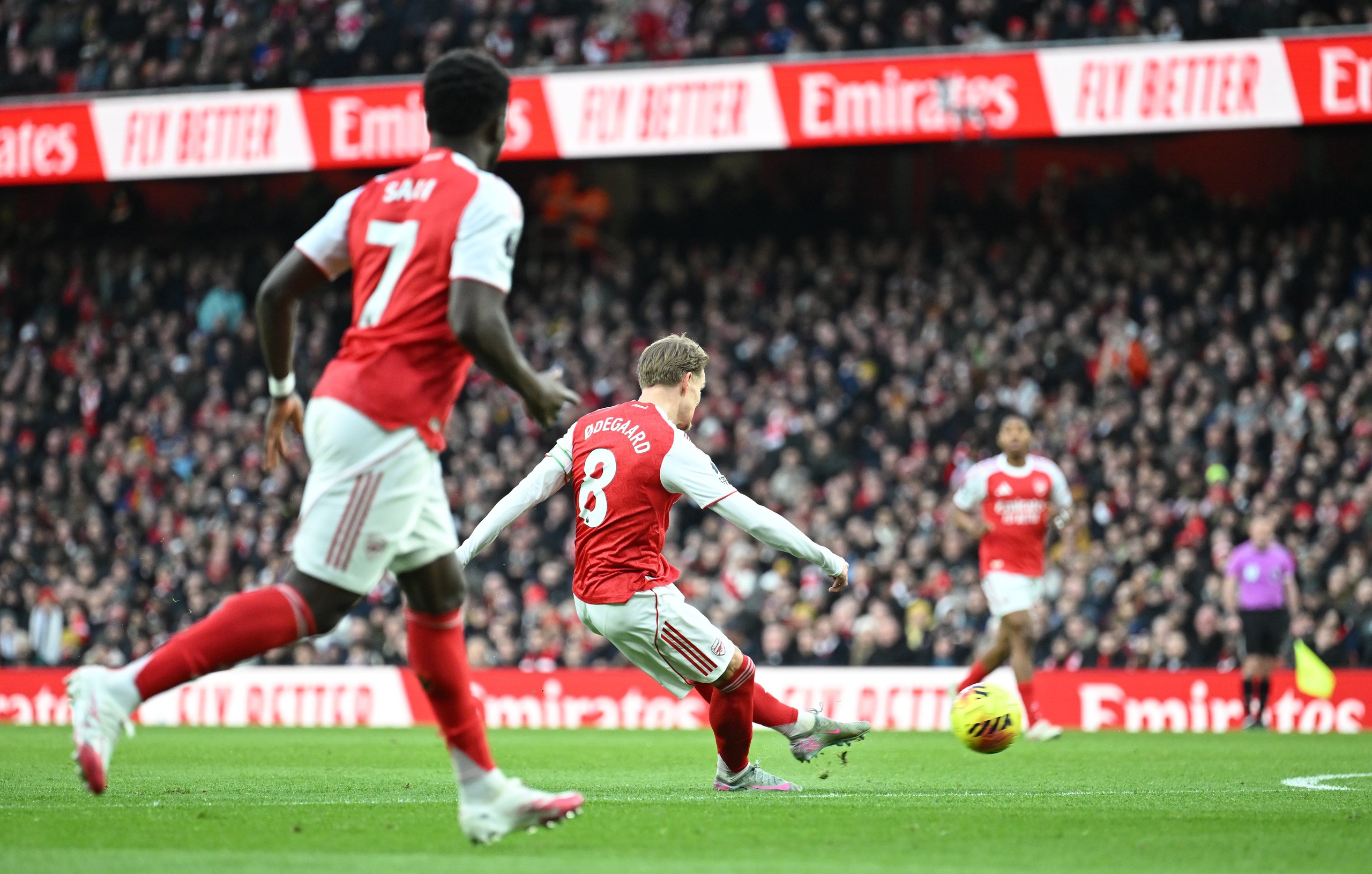 Phút 4: Arsenal phối hợp tấn công nguy hiểm, đáng tiếc rằng, pha dứt điểm của Saka bị thủ thành Verbruggen chặn lại.