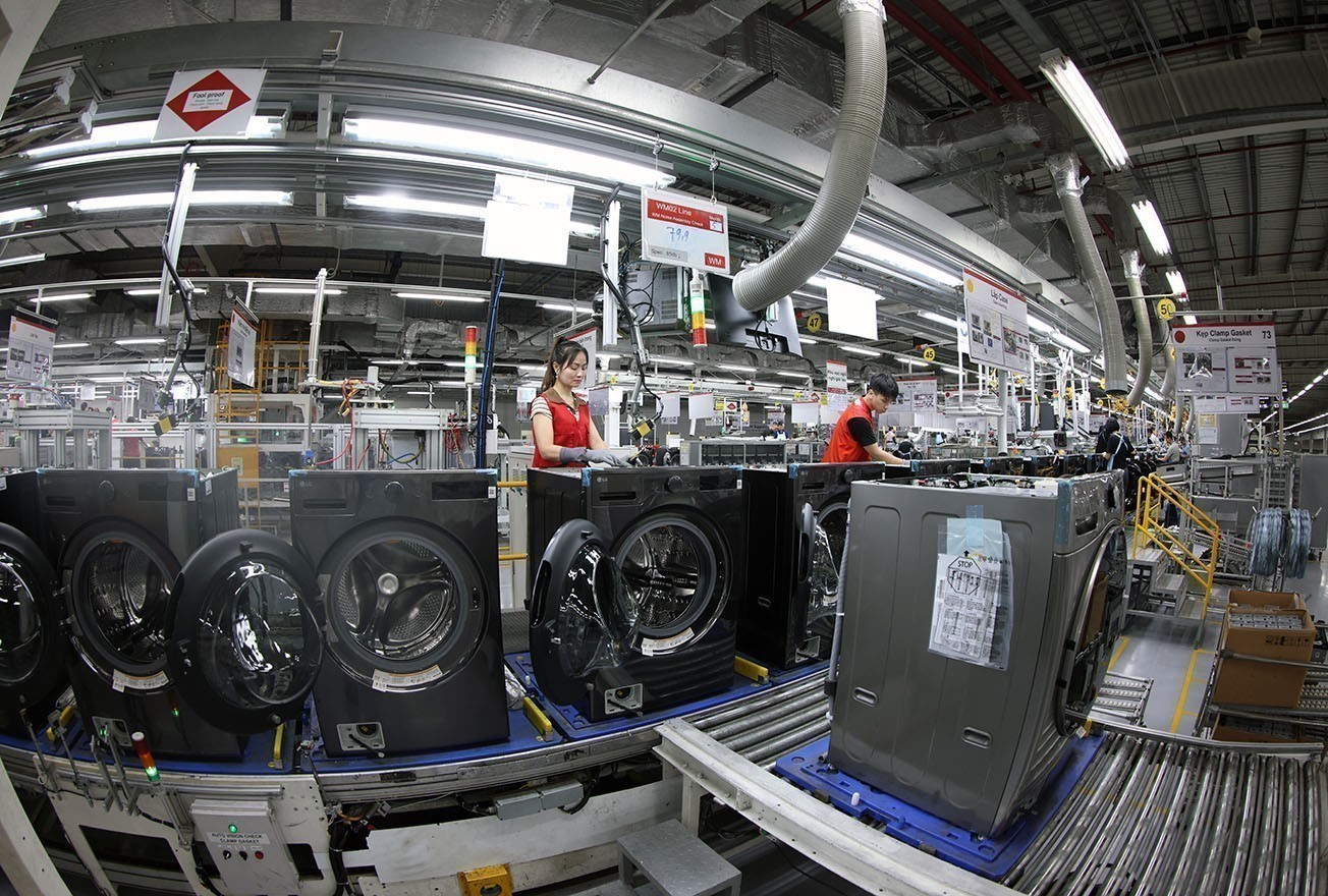 Dây chuyền lắp ráp máy giặt tại nhà máy của Công ty TNHH LG Electronics Việt Nam Hải Phòng (100% vốn Hàn Quốc), tại Khu công nghiệp Tràng Duệ, xã Lê Lợi, huyện An Dương, thành phố Hải Phòng. Ảnh: Vũ Sinh - TTXVN
