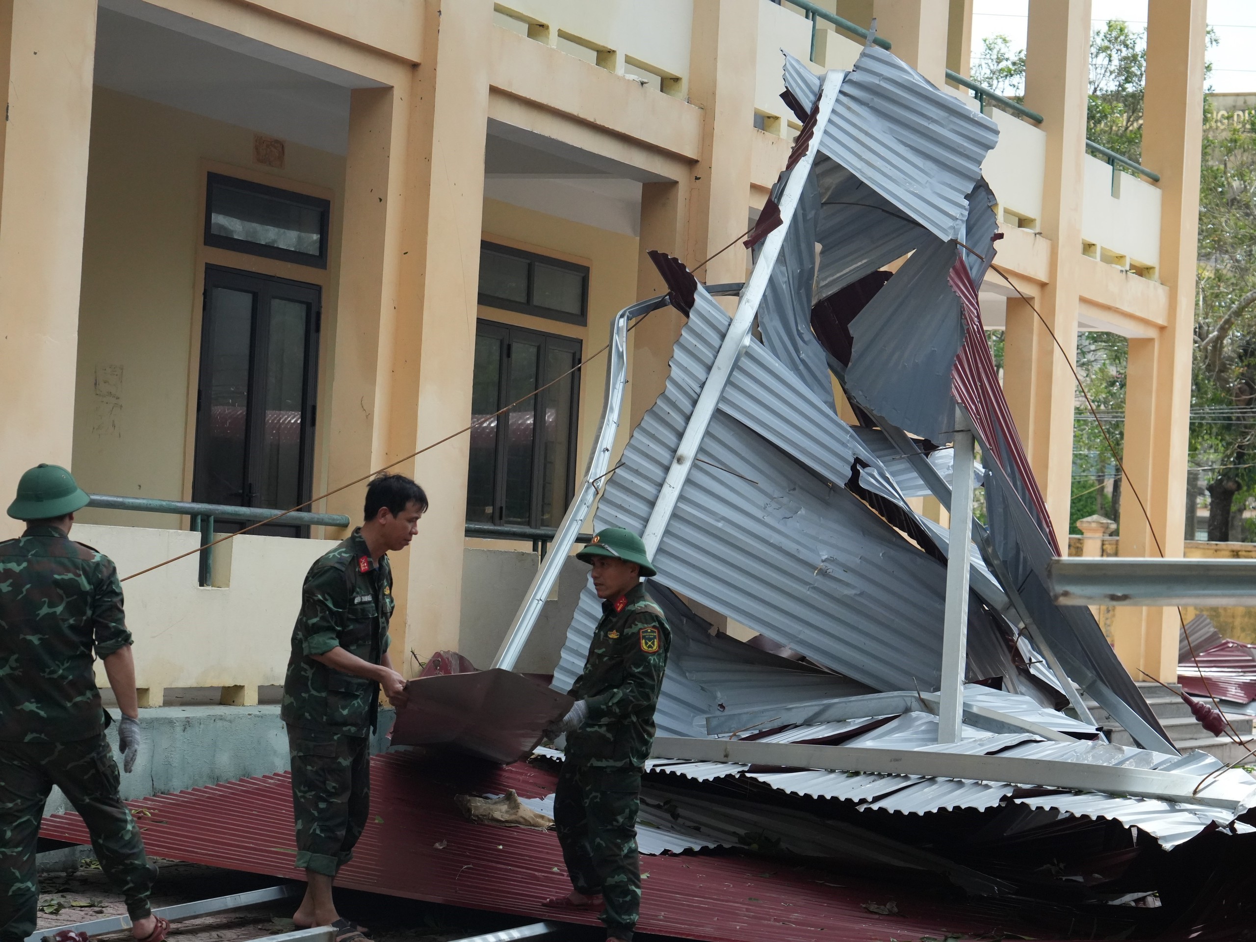 Lực lượng chức năng hỗ trợ các nhà trường dọn dẹp sau bão số 10 ở Nghệ An. Ảnh: Bích Huệ - TTXVN