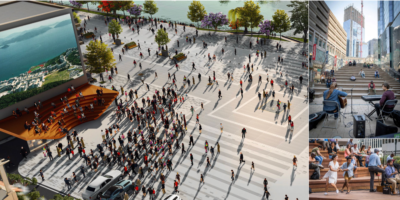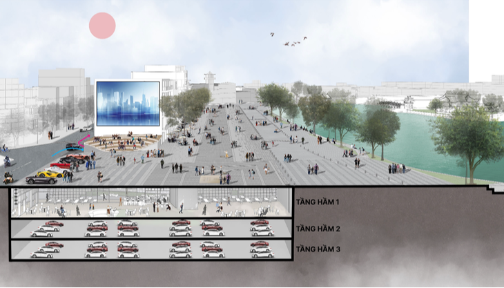 Phối cảnh không gian ngầm với 3 tầng hầm dưới quảng trường; dự kiến bố trí không gian văn hóa, thương mại tại tầng hầm 1, khu vực đỗ xe tại tầng hầm 2, 3; trường hợp không bố trí đỗ xe có thể sử dụng thành không gian lưỡng dụng