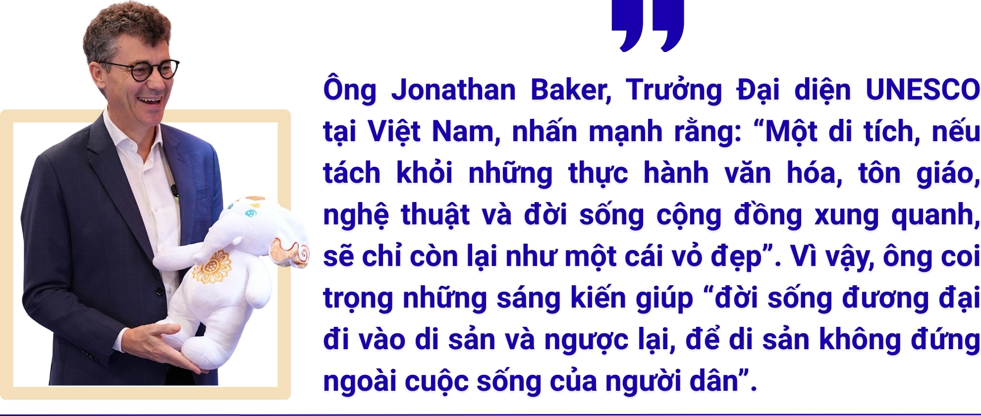 Ông Jonathan Baker, Trưởng Đại diện UNESCO tại Việt Nam, nhấn mạnh rằng: "Một di tích, nếu tách khỏi những thực hành văn hóa, tôn giáo, nghệ thuật và đời sống cộng đồng xung quanh, sẽ chỉ còn lại như một cái vỏ đẹp". Vì vậy, ông coi trọng những sáng kiến giúp "đời sống đương đại đi vào di sản và ngược lại, để di sản không đứng ngoài cuộc sống của người dân".