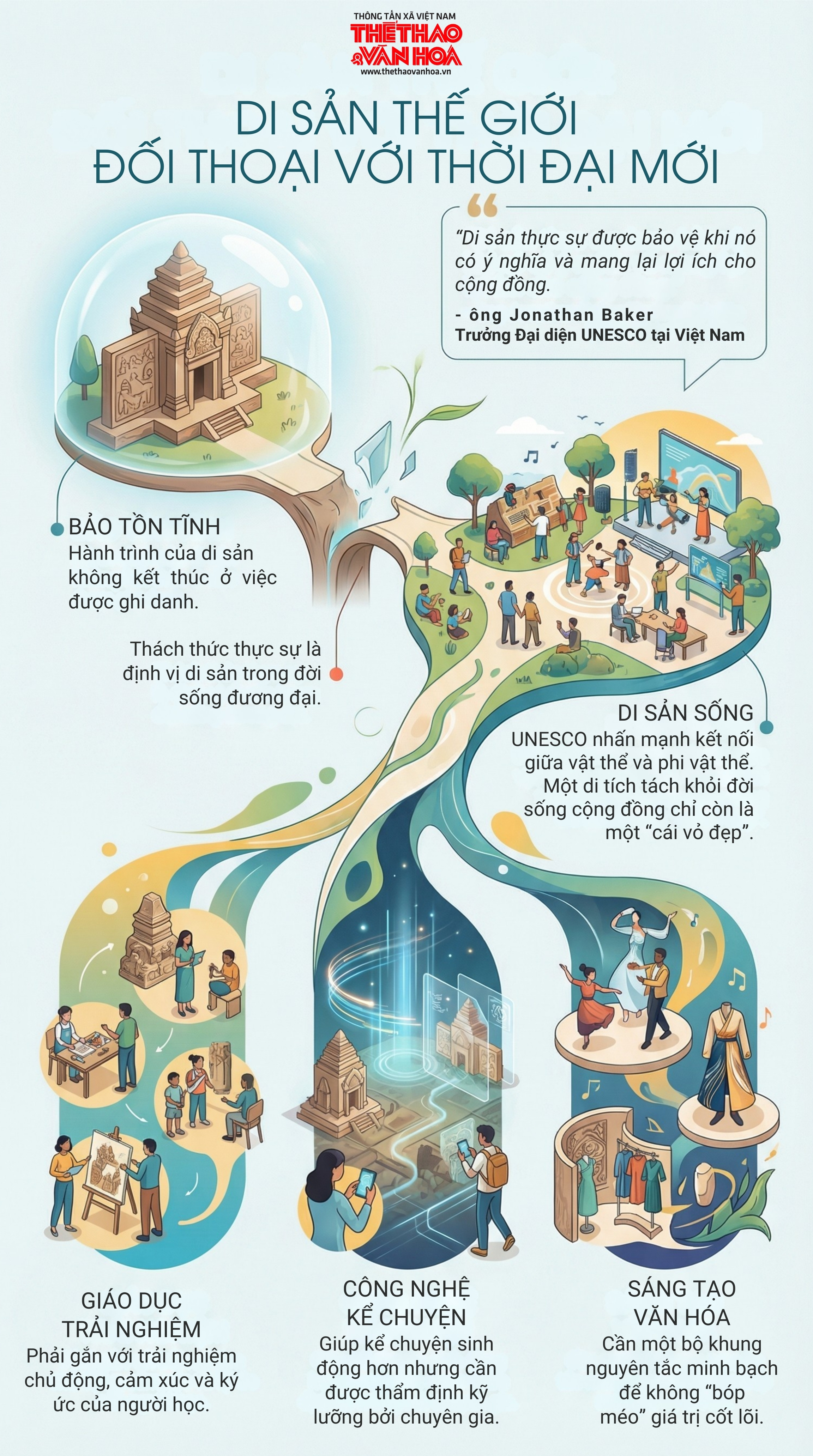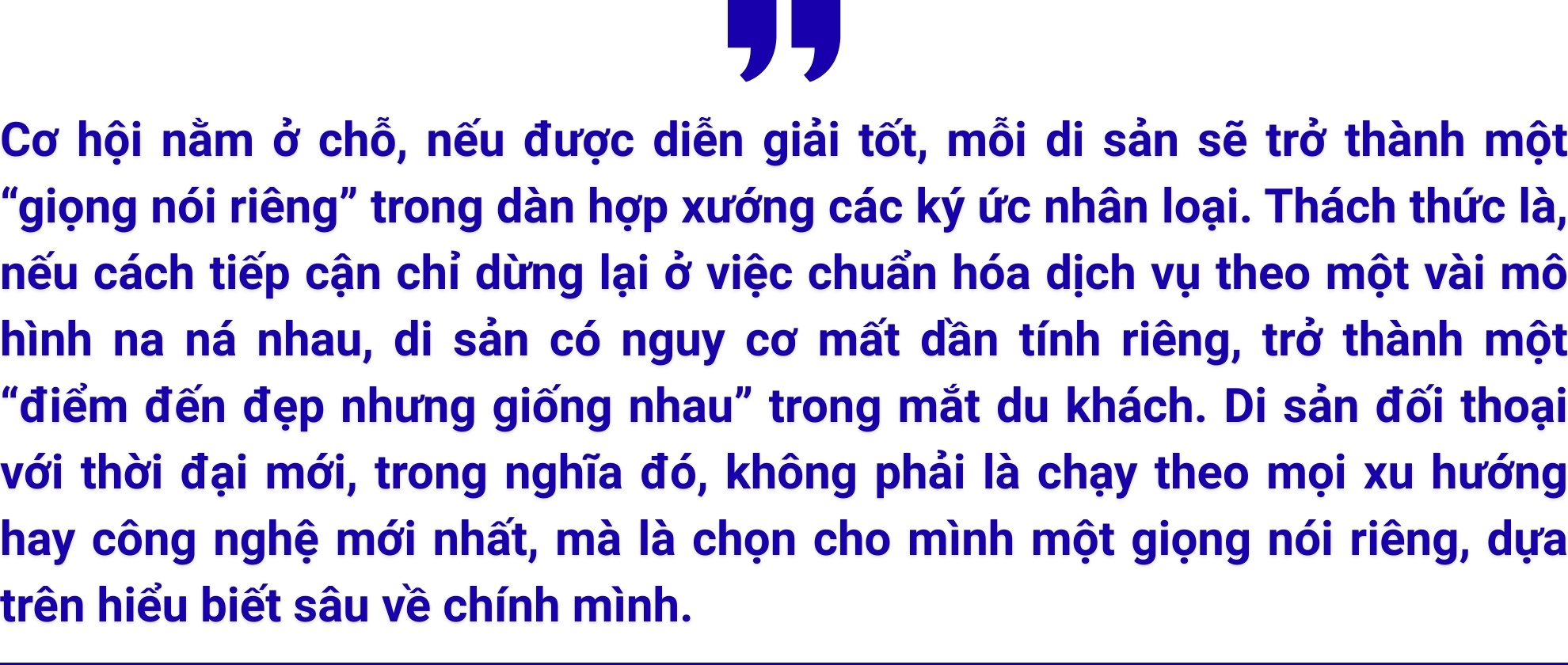 Cơ hội nằm ở chỗ, nếu được diễn giải tốt, mỗi di sản sẽ trở thành một "giọng nói riêng" trong dàn hợp xướng các ký ức nhân loại. Thách thức là, nếu cách tiếp cận chỉ dừng lại ở việc chuẩn hóa dịch vụ theo một vài mô hình na ná nhau, di sản có nguy cơ mất dần tính riêng, trở thành một "điểm đến đẹp nhưng giống nhau" trong mắt du khách. Di sản đối thoại với thời đại mới, trong nghĩa đó, không phải là chạy theo mọi xu hướng hay công nghệ mới nhất, mà là chọn cho mình một giọng nói riêng, dựa trên hiểu biết sâu về chính mình.