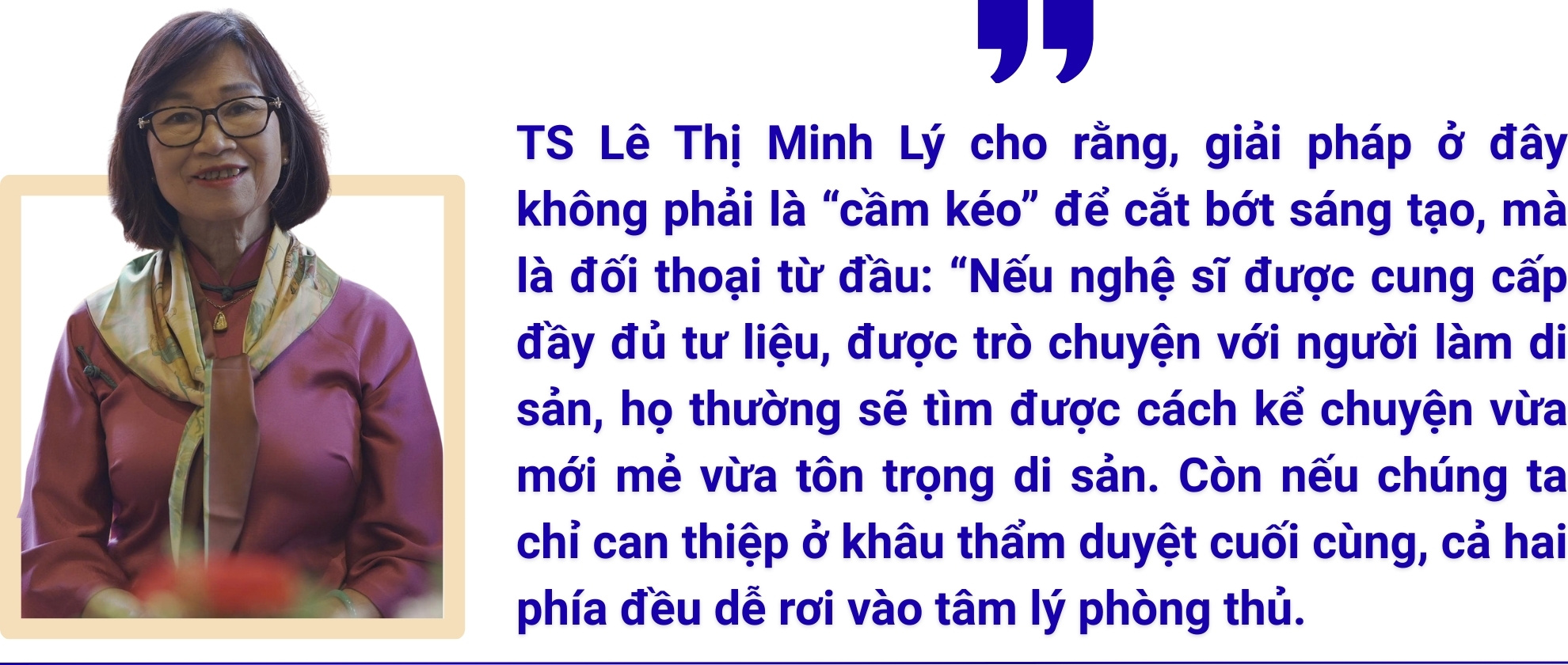 TS Lê Thị Minh Lý cho rằng, giải pháp ở đây không phải là "cầm kéo" để cắt bớt sáng tạo, mà là đối thoại từ đầu: "Nếu nghệ sĩ được cung cấp đầy đủ tư liệu, được trò chuyện với người làm di sản, họ thường sẽ tìm được cách kể chuyện vừa mới mẻ vừa tôn trọng di sản. Còn nếu chúng ta chỉ can thiệp ở khâu thẩm duyệt cuối cùng, cả hai phía đều dễ rơi vào tâm lý phòng thủ".